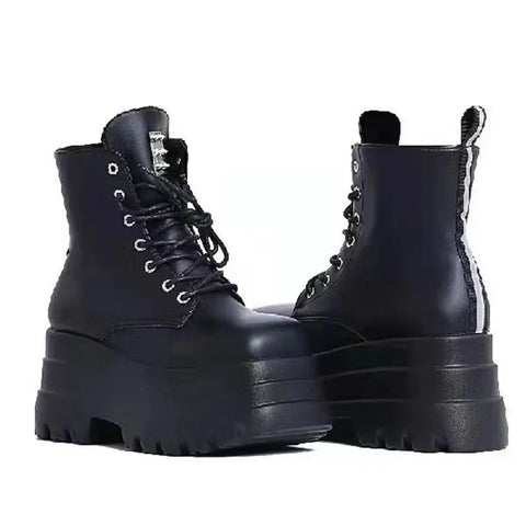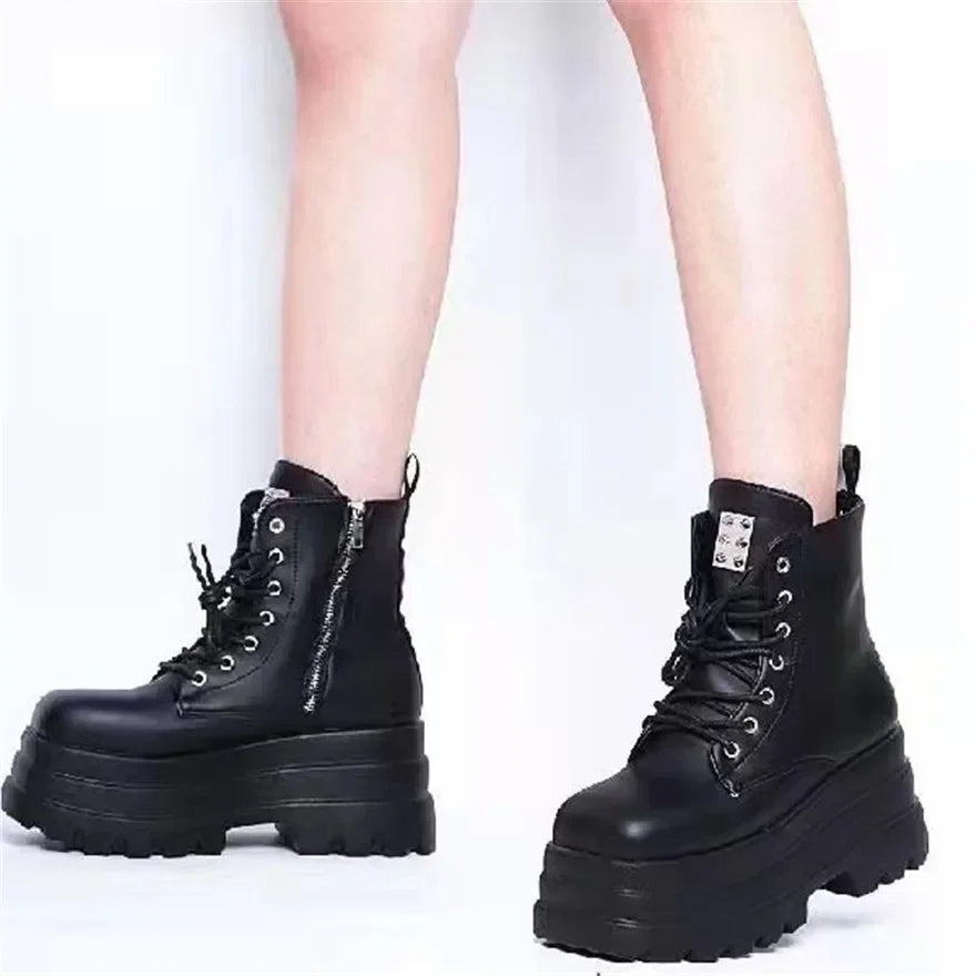 Get ready to make a bold statement this fall with our beautiful Gothic platform boots made of soft leather. These boots are designed for women who aren't afraid to stand out from the crowd, combining comfort and style with a touch of rebellion. The imposing silhouette is accentuated by metal studs that add a unique shine to every step. With practical lacing and a side zipper, the boots are not only easy to put on but also provide secure support for everyday adventures. The thick, textured sole ensures optimal grip, whether you're stomping over the cobblestones of the city or making a splash at a concert. Show off your individuality and embrace the edgy side of alternative fashion with these boots that are just waiting to be paired with your boldest outfits. Don’t miss the opportunity to complete your wardrobe with this essential piece that embodies attitude and elegance.