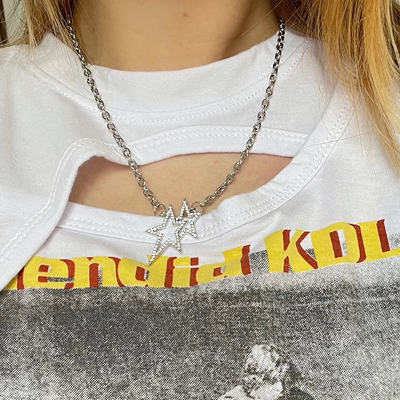 Discover a piece of jewelry that expresses rebellious elegance and cosmic finesse - our Ras-de-Cou Étoile necklace from the Korean fashion collection. This choker is designed to capture the essence of starry nights and the shine of K-pop celebrities, making it the perfect accessory for any lover of alternative fashion. The necklace features two star pendants, one larger and one smaller, adorned with sparkling crystals that shimmer in the light. These stars hang from a fine mesh chain, creating a delicate yet striking effect. The silver metal, reminiscent of moonlight, complements your gothic, grunge, or E-girl outfits and adds a Kawaii touch that won't go unnoticed. Whether you're heading to a concert or just want to add a touch of fantasy to your everyday outfit, this Choker Star necklace will quickly become your loyal companion.