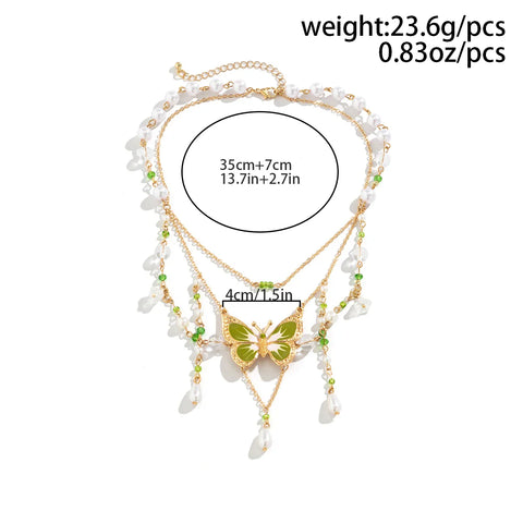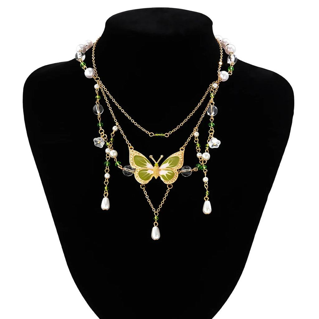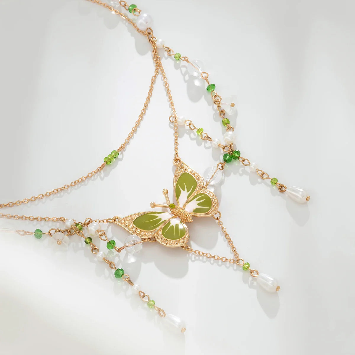 Dive into a world of grace and finesse with our majestic choker necklace featuring a butterfly. It has been meticulously crafted to elevate your outfit and is the perfect jewelry piece for those looking to add a touch of poetry to their look. This captivating multi-layered necklace draws attention with its spectacular, intricately designed butterfly pendant, adorned with vibrant green accents symbolizing transformation and beauty. Radiant imitation pearls, harmoniously scattered along the golden chain, lend this piece a touch of timeless elegance. The sequence of pearls gracefully cascades down in a waterfall of crystal-clear drops, swaying gently to capture the light and subtly emphasize your movement. This necklace, intended for extraordinary moments as well as for enhancing everyday life, is the perfect wedding accessory or a thoughtful gift to impress a loved one.