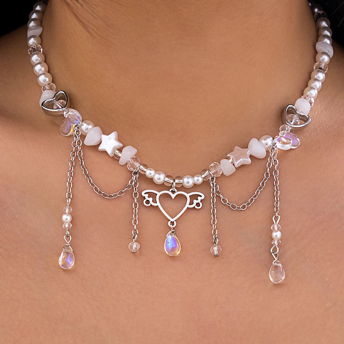 Discover a piece of jewelry that embodies softness and originality, our charming necklace infused with the alternative spirit. This necklace, distinguished by its arrangement of luminous crystal beads and captivating details, adds a touch of fantasy to your outfit. The meticulously crafted necklace features a selection of uniquely shaped beads in faux crystal, including round beads in pearl white and translucent stars that capture the light and reflect it with subtle elegance. The centerpiece is a delicately hanging heart adorned with wings, reminiscent of freedom and limitless dreams. The teardrop pendants, delicately wrapped with metal wire and suspended from fine chains, impart graceful movement to every step. These pendants create an intriguing dynamic as you move, allowing the light to sparkle with a seductive prismatic effect.