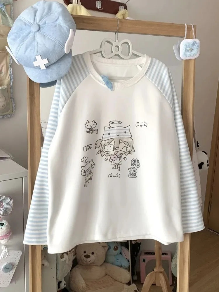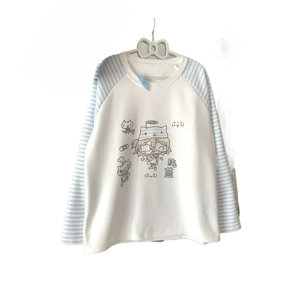 T-Shirt in Japanese Style Cute Sleeves Blue Striped and Cute Print.