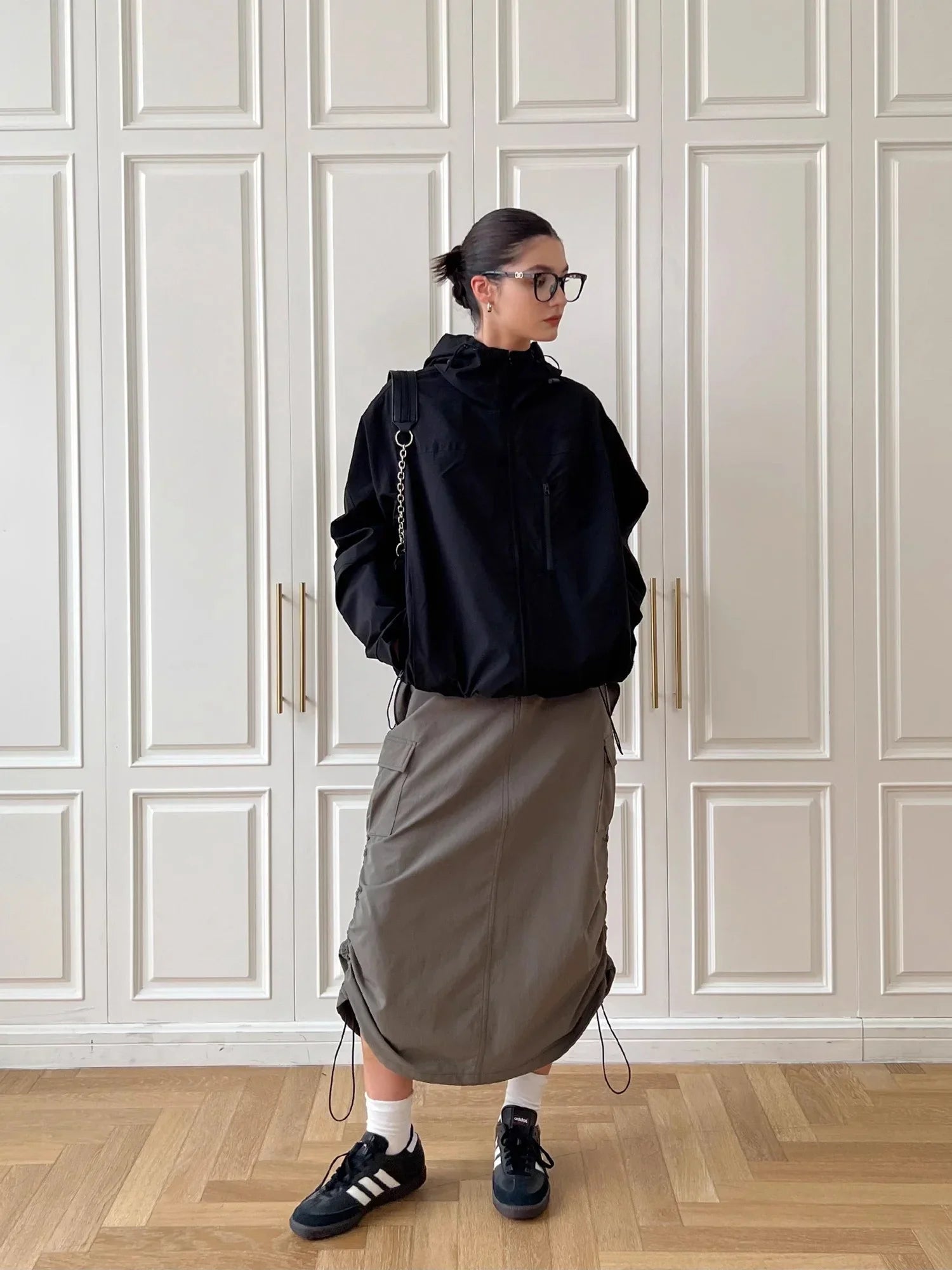 Discover the perfect blend of functionality and style with our taupe windbreaker jacket with hood - a must-have for anyone boldly embracing the Gorpcore trend. This jacket is designed for women who do not want to choose between comfort and trend, and it will quickly become the highlight of your streetwear wardrobe. Our windbreaker comes in a calming taupe tone and effortlessly combines urban fashion with outdoor robustness. The adjustable hood ensures you are optimally protected from the elements, while tactical details like black straps and zippered pockets add a touch of utility character. Whether you are exploring the streets of the city or embarking on an adventure in nature, this versatile garment covers you in style and offers unmatched freedom of movement due to its thoughtful design. Pair it with black leggings for a contrasting and modern look.