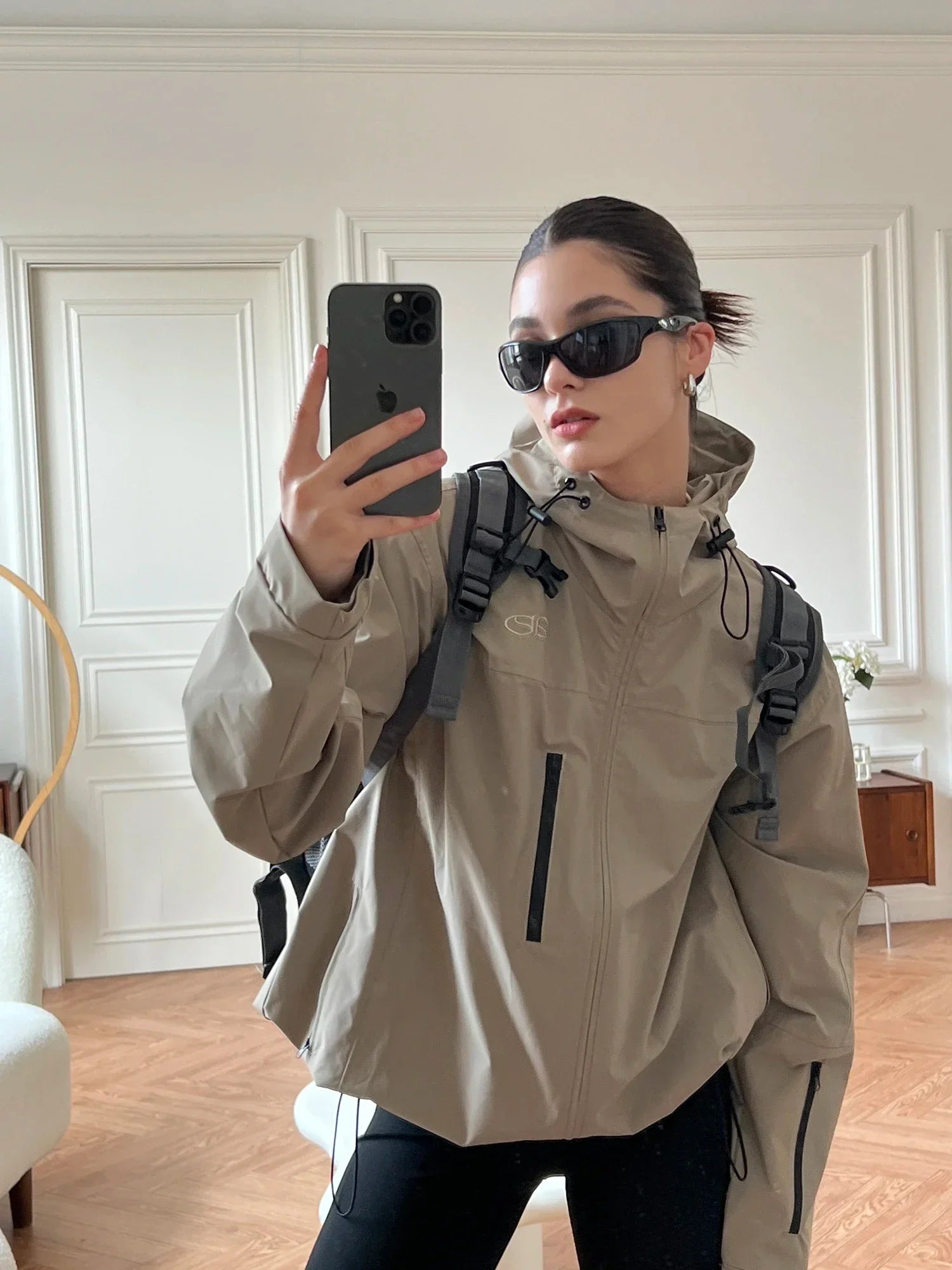 Taupe Gorpcore Windbreaker Jacket with Hood for Women