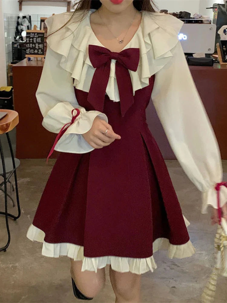 Immerse yourself in a world full of grace and style with our Lolita Gothic ensemble, an ode to femininity with a touch of rebellion. The two-piece outfit enchants with a cream-colored long-sleeve shirt adorned with subtle ruffles, adding rich texture and enchanting movement to every gesture. The waterfall collar creates a dramatic effect, further emphasized by a magnificent burgundy bow that captures attention and reminds us of the classicism of Victorian costumes. The scarlet dress flows down and harmonizes with the shirt thanks to the contrasting ruffles that dance along the hem, giving the silhouette a touch of preppy chic. The fitted waist and flared pleated skirt celebrate the curves while ensuring an impeccable lightness. Perfect for a standout appearance at a convention, a themed party, or simply for an elegant city stroll.