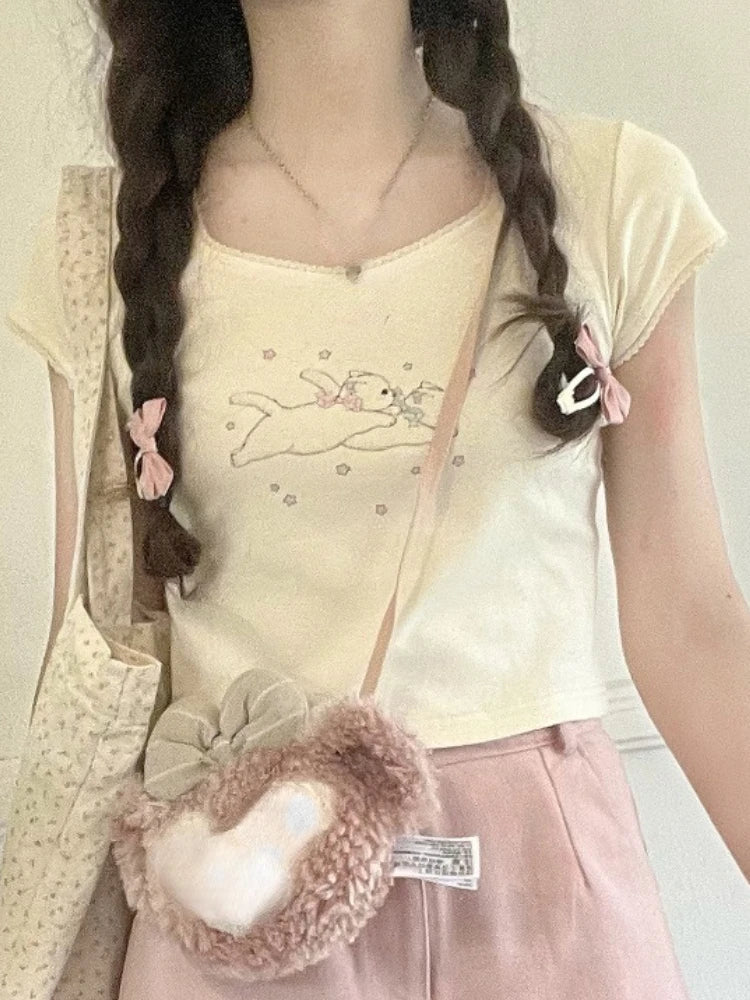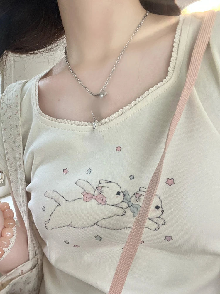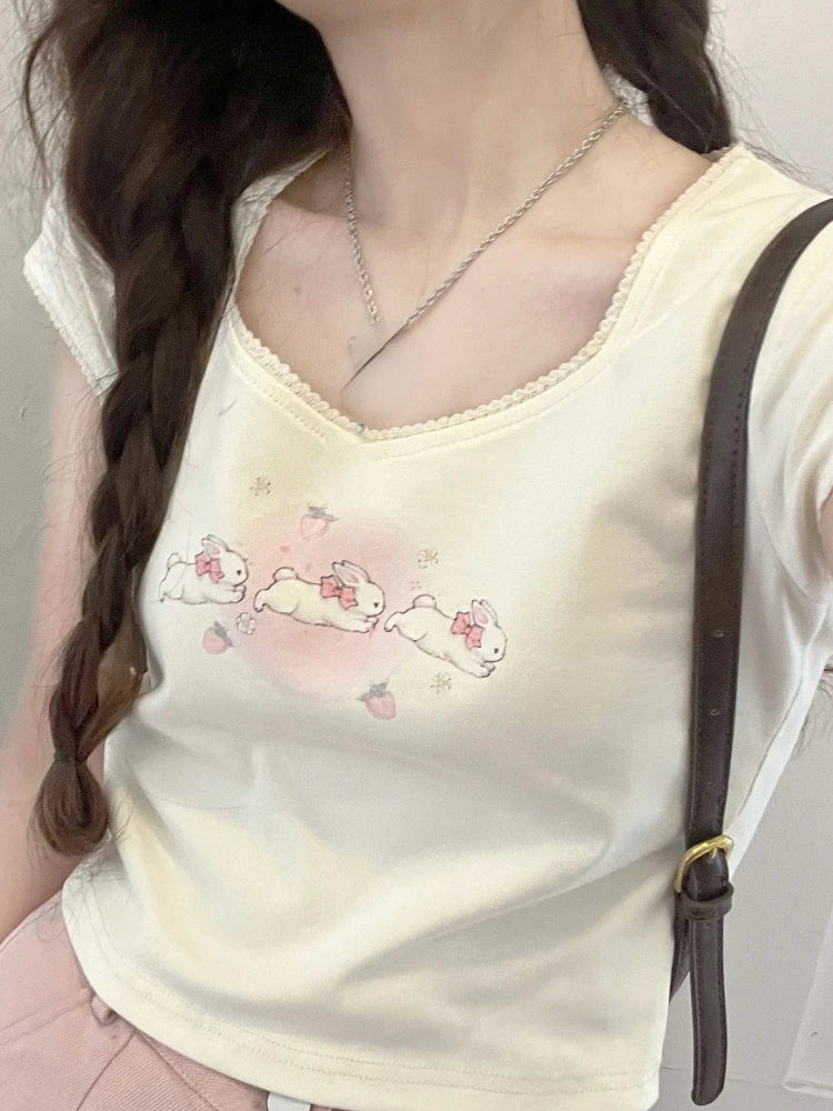 Let your wardrobe run wild with this enchanting Japanese Kawaii T-shirt - a must-have for anyone who loves the Lolita style with a subtle Gothic touch. The top is in a delicate cream color, adding a touch of sweetness and elegance to any outfit. The short sleeves and lightweight fabric make it the perfect choice for sunny days, while the delicately crafted lace details at the neckline add a refined feminine touch. At the center of the captivating print are cute white bunnies, some with pink bows, conjuring a sweet dream world. This T-shirt is not just a fashion accessory, but a ticket to a world where fantasy and style exist harmoniously side by side. Pair it with a high-waisted skirt or pastel pants to complete your look as a Gothic Sweet Lolita with grace and originality.