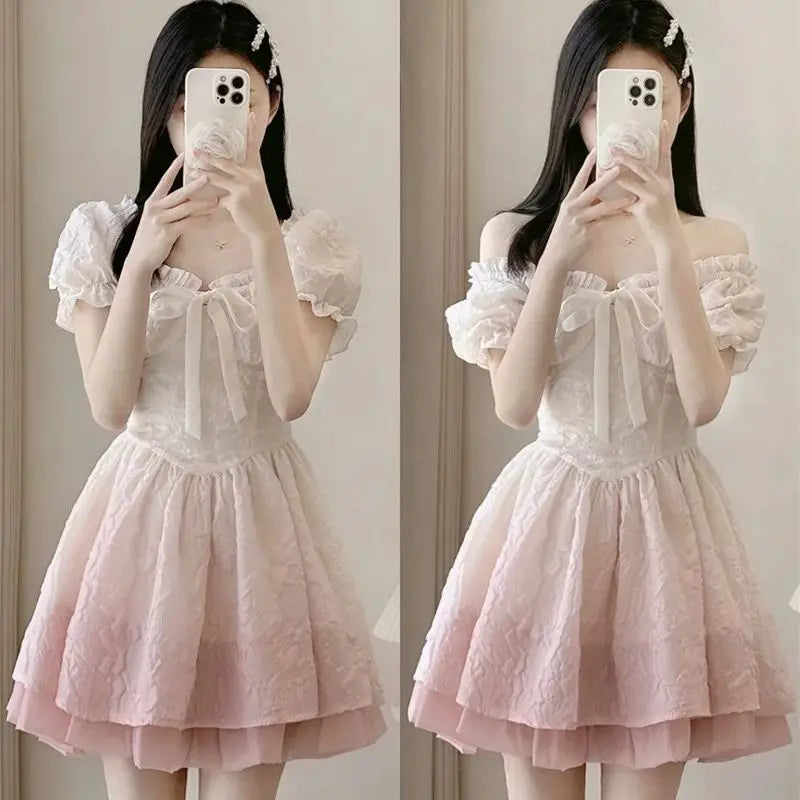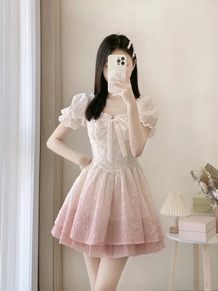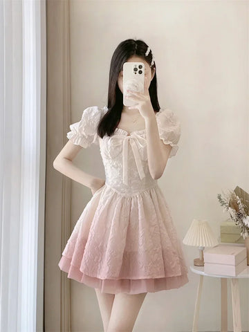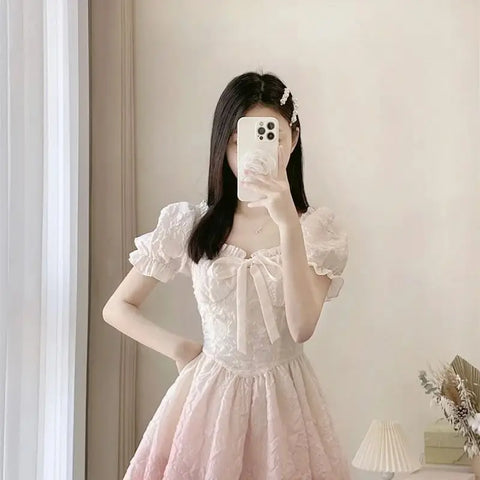 Dive into the enchanting world of Gothic Lolita with this charming dress in powder pink, which is a must-have for all followers of an alternative fashion filled with sweetness and femininity. The square collar gently highlights your headwear, while the puff sleeves add a timeless and romantic touch. This masterpiece evokes a fairy-tale world that seems to have sprung from a Victorian fairy tale. The dress, made from a airy fabric with a hint of mesh, is adorned with a delicate corset that elegantly outlines the silhouette. It details your waist with subtle elegance and enhances the charm of the flared skirt. The lace embellishments and satin ribbons emphasize the vintage look, while the structured fabric with its subtly embossed floral pattern adds a dimension of sophistication and richness of detail.