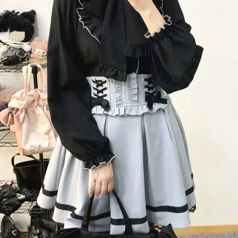 The delicate and mysterious world of Lolita fashion with our Lolita Gothic Japanese skirt, a true gem for all who dare to embrace a unique and elegant style. This skirt, expressing a rebellious softness through its powder pink hue, is accentuated by contrasting black details that give it a refined distinction. The corset belt with intertwined ribbons evokes the romance of a bygone era, while the ruffles and lace hems add a touch of grace and femininity. The arranged ribbons create a bandage effect that flattering emphasizes the waist and promises to highlight various silhouettes. The skirt is made from high-quality fabric that feels good and looks great. It features generous pleats that ensure a wide, flowing movement with every step. A decorative ribbon adorns the front of the skirt, providing a charming focal point that draws the eye and underscores the Lolita aesthetic.