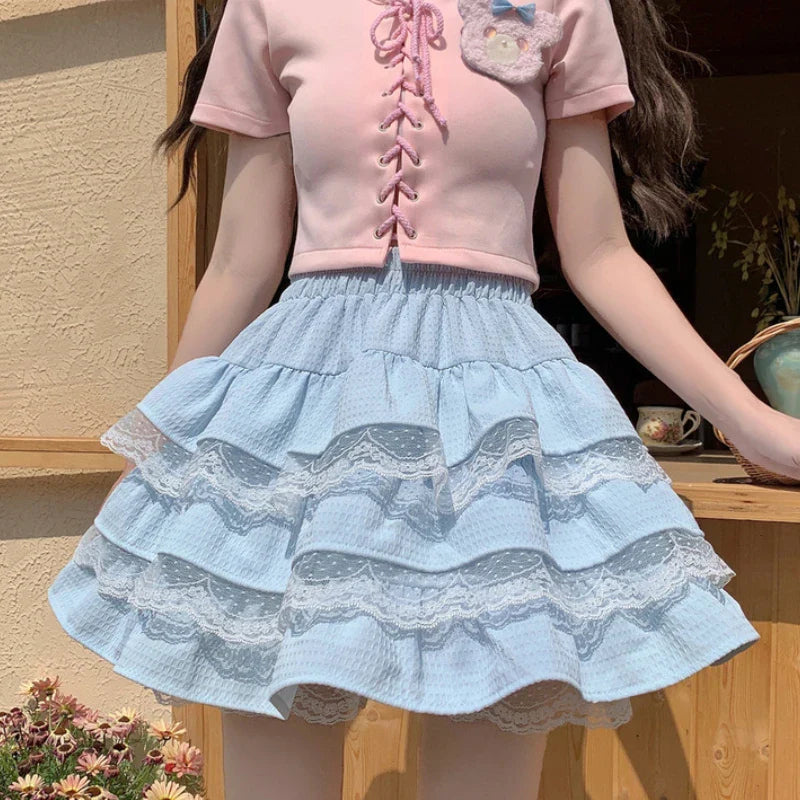 Dive into a fairytale world full of sweetness and style with our high-necked Lolita Cutecore skirt. This enchanting piece is a real eye-catcher and a great addition to your alternative wardrobe. The skirt, inspired by the Lolita movement, is in a delicate sky blue reminiscent of spring dreams. The flattering A-line is accentuated by overlapping ruffles, each adorned with delicate lace, creating a rich texture and a romantic look. The gathering at the waist ensures a comfortable fit while highlighting the graceful silhouette. This carefully crafted, charming skirt is perfect for fans of Cute-Core fashion who want to add a touch of fantasy to their everyday lives. The high waist is emphasized by meticulous craftsmanship, while the flared cut allows for plenty of freedom of movement, enabling you to move easily and elegantly.