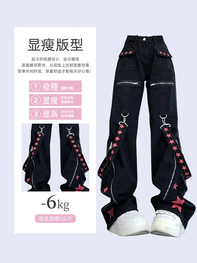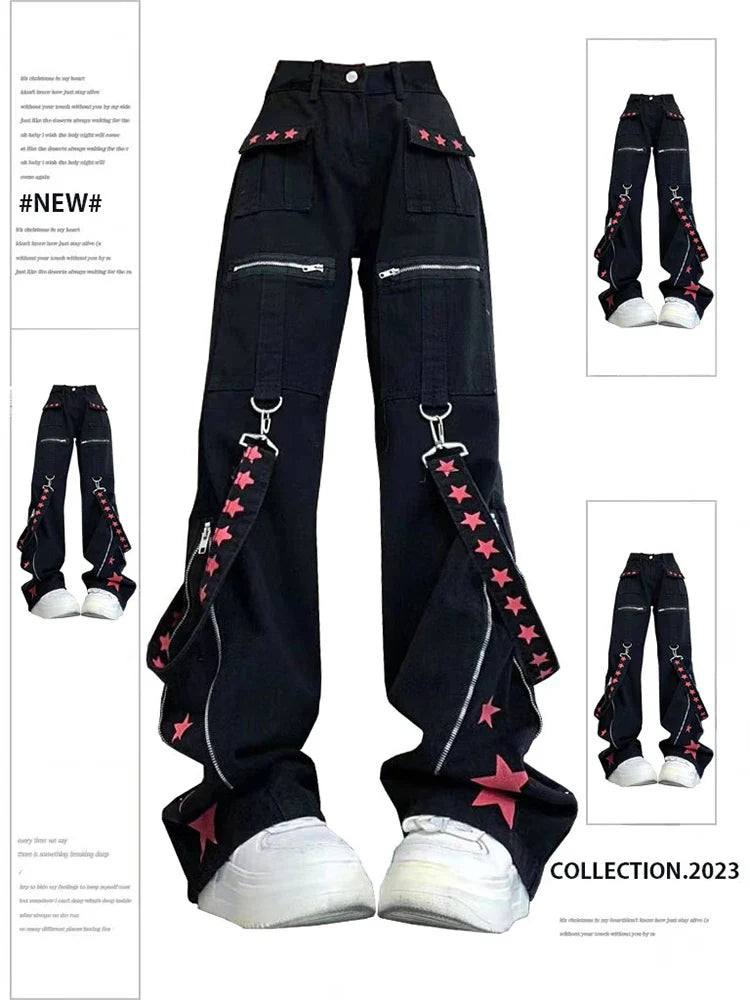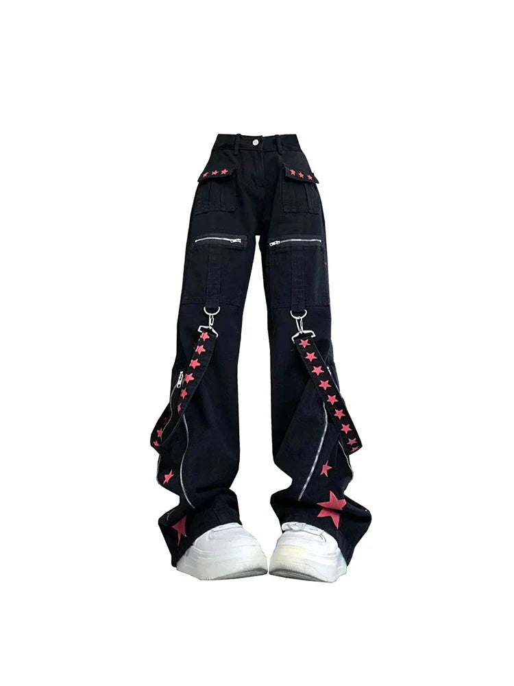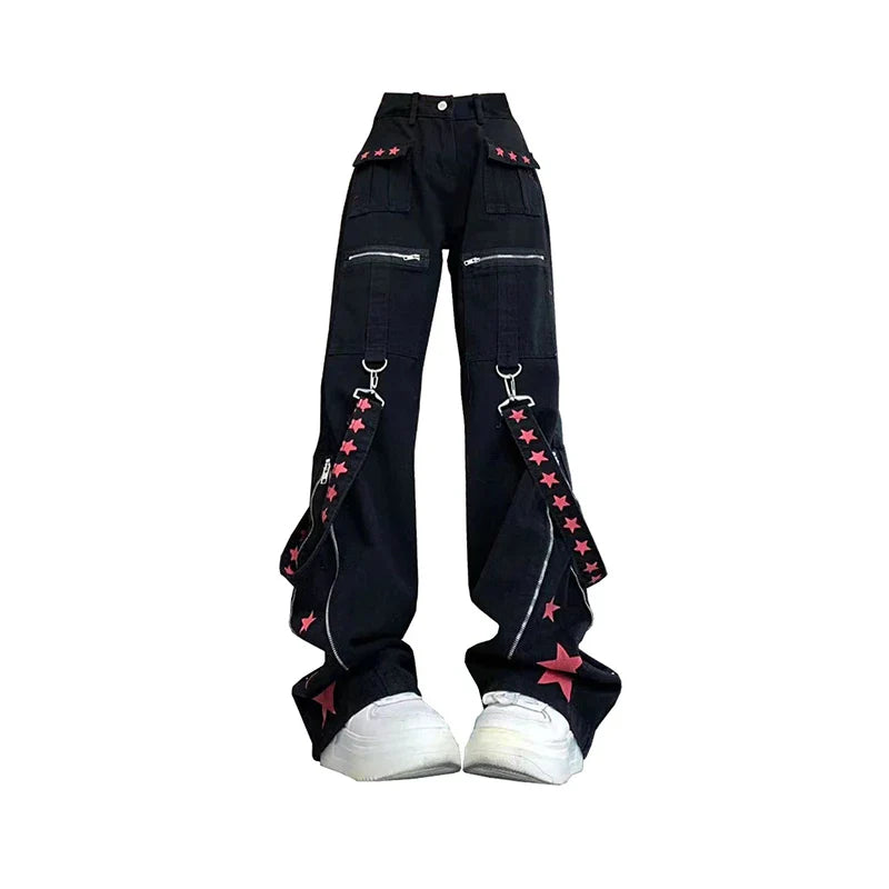 Made from robust and comfortable fabric, this loose-fitting jean is your new everyday companion, perfect for festivals, concerts, or simply adding a touch of originality to your daily routine. This deep black model is punctuated with decorative pink and red elements for a striking contrast and a splash of color. Each leg is adorned with a galaxy of large and small stars, adding a celestial dimension to your look.