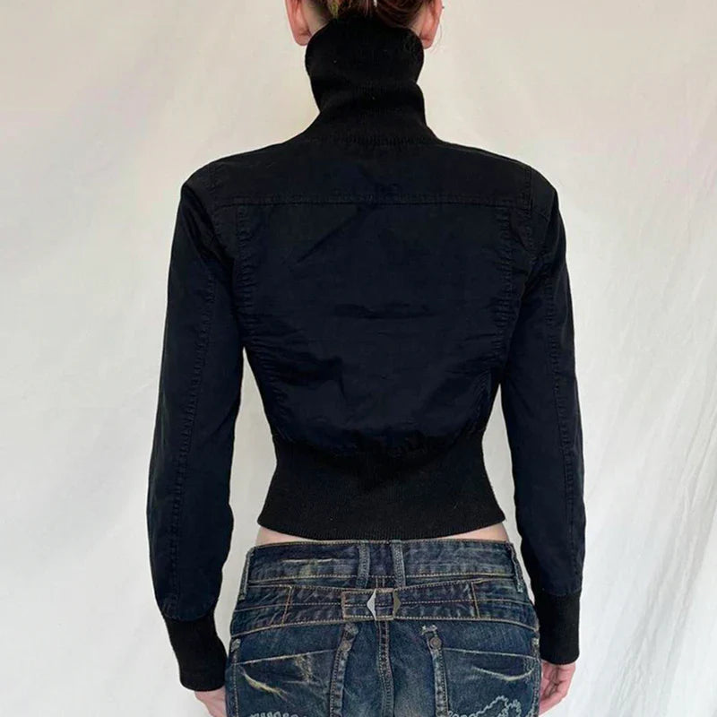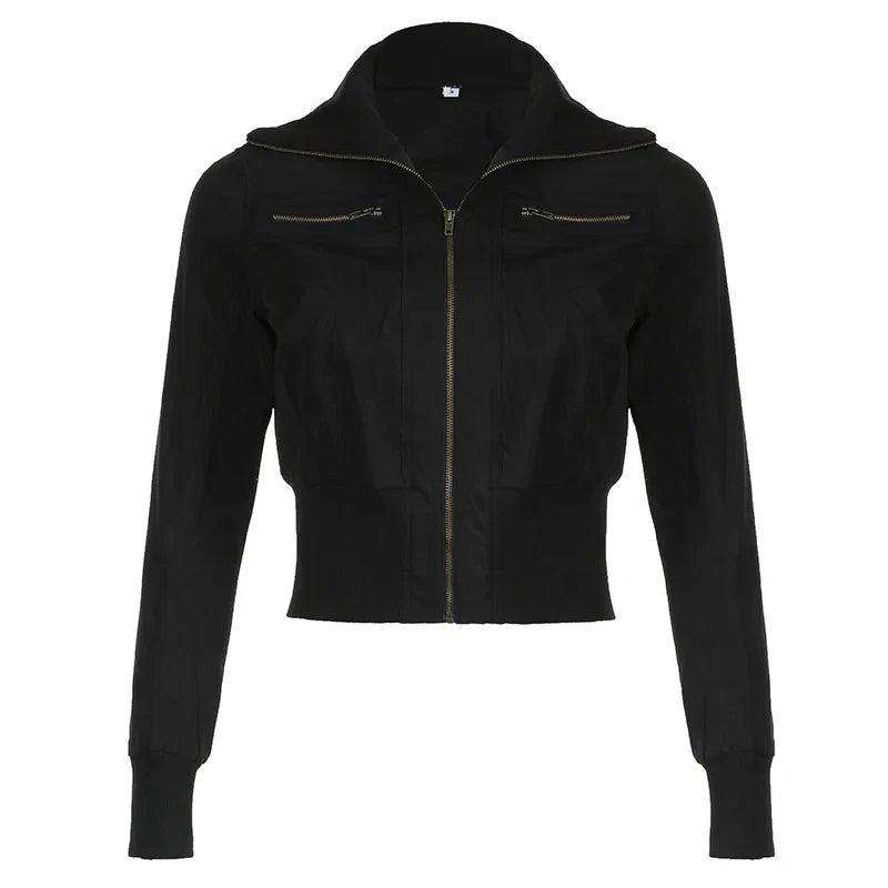Discover our elegant black jacket with a zipper, ideal for adding a daring touch to your autumn and winter wardrobe. Designed with a stand-up collar that can be stylishly closed, this fashionable piece offers a fitted silhouette with long sleeves and ribbed cuffs for optimal comfort. It is made from a soft, durable fabric and features zippered pockets at the front, perfect for keeping your essentials close at hand. The cropped design accentuates your waist, allowing you to easily pair the jacket with your favorite jeans or a chic skirt for a unique alternative look. Whether for a night out or a relaxed day in the city, this jacket ensures you stay warm while keeping your style on point. Embrace the alternative spirit and let this versatile piece enchant you, guaranteed to be noticed!
