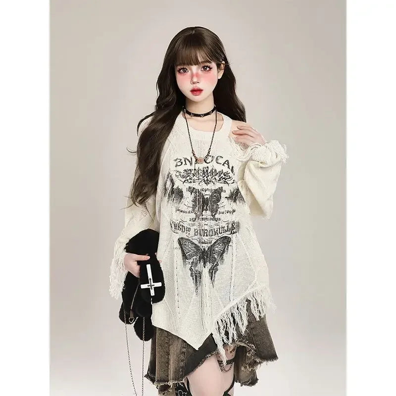 Discover our Butterfly Pullover Gothic Coquette, a must-have for all those who love alternative fashion. With its loose knit pattern and casual fit, this pullover offers ultimate comfort while highlighting your unique style. It features an exciting butterfly print and Gothic motifs, embodying the perfect combination of dark aesthetics and flirtatious delicacy. The wide sleeves and fringes give it an original touch that won't go unnoticed. Whether for a trip to the city or an evening with friends, this pullover perfectly complements your streetwear outfit. Add a mysterious touch to your wardrobe and feel comfortable while doing so. Don't wait any longer and express your personality with this essential piece of your alternative collection!