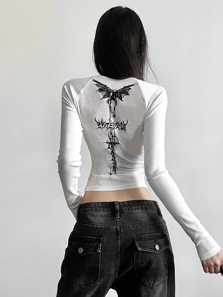 Discover our latest scream of alternative fashion for those who dare to assert their style: the Women's Round Neck Long Sleeve T-Shirt with Grunge Print. This top is perfect for fans of the grunge and goth looks and embodies boldness and individuality. It is made from soft, breathable fabric that offers perfect wearing comfort for all urban exploration trips or rock parties. With its long sleeves, it ensures that you stay stylishly warm even in cooler seasons. The round neckline highlights your headwear, while the fitted cut accentuates your silhouette. But what truly makes the heart of this T-shirt race is the striking print on the back. A dark dragon wing design with grunge typography creates an unforgettable visual effect and guarantees that you will never go unnoticed. Whether you pair it with ripped black jeans or a tulle ruffle skirt, this T-shirt is the perfect backdrop to express your unique identity.