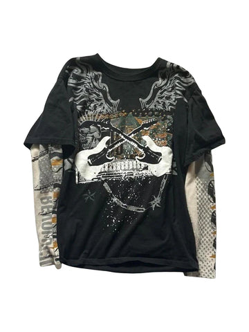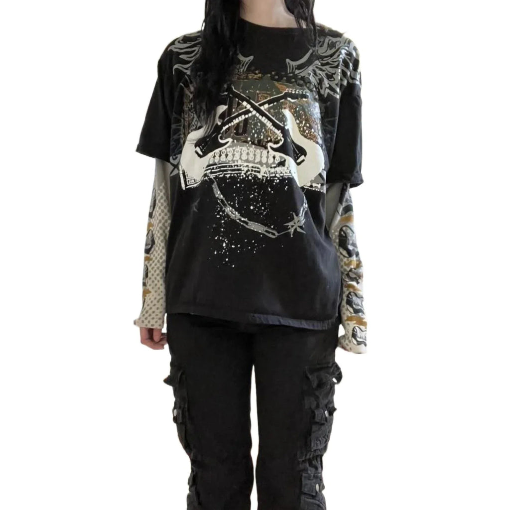 Discover the nostalgic charm of the Y2K style combined with a fairytale grunge touch with our exclusive graphic crop top. This must-have for the alternative wardrobe is a true fashion chameleon, designed for women who dare to boldly mix eras and aesthetics. Our model features a comfortable, casual cut with a cropped length that is perfect for emphasizing a modern, effortless silhouette. The soft cotton fabric caresses the skin while the wide sleeves offer absolute freedom of movement. The eye-catching look, inspired by the imagination of grunge and embellished with sparkling details, will become the hero of your outfit. The intricate patterns, combining a winged horse with twinkling stars, evoke a world where the mystical meets the rebellious. Framed by subtle geometric and tribal patterns, this design will undoubtedly attract attention and express your individuality. Style it with a distressed denim for a standout look or add your personal expression to your style.