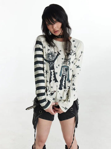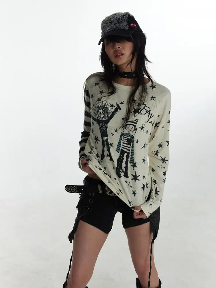 Highlight your bold style with this unique Gothic T-shirt for women, inspired by the 2000s. It features an exciting blend of shaded patterns and sparkling stars, as well as striking illustrations of punk characters that add a touch of originality to your wardrobe. The long-sleeve shirt is made from soft and comfortable material, suitable for any season.