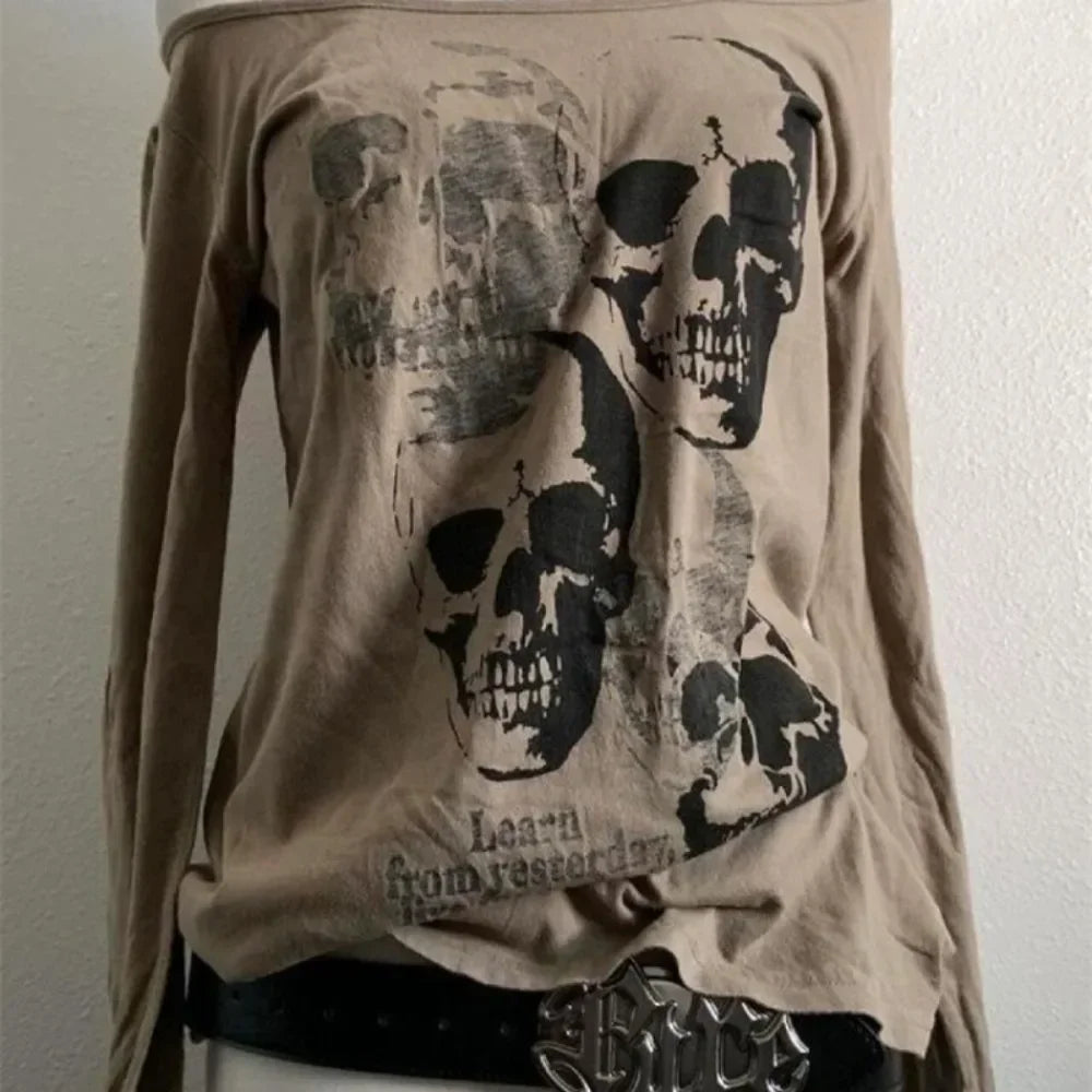 Dive into the quirky world of alternative fashion with this chic and sassy Y2K T-shirt. This enchanting top made of soft ribbed fabric features a stylish design with a free neckline, perfect for revealing a hint of sensuality while staying casual. The fantastic skull print on a warm beige background creates a mysterious atmosphere, while the text "Learn from yesterday" serves as a reminder of the past while highlighting the originality of the present. This T-shirt is ideal for fans of the fairycore style who want to express their personality without compromising on comfort. It pairs perfectly with cut-out jeans or a matte skirt, adding a unique touch to your wardrobe.