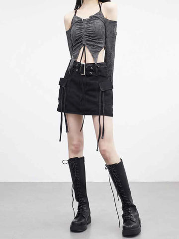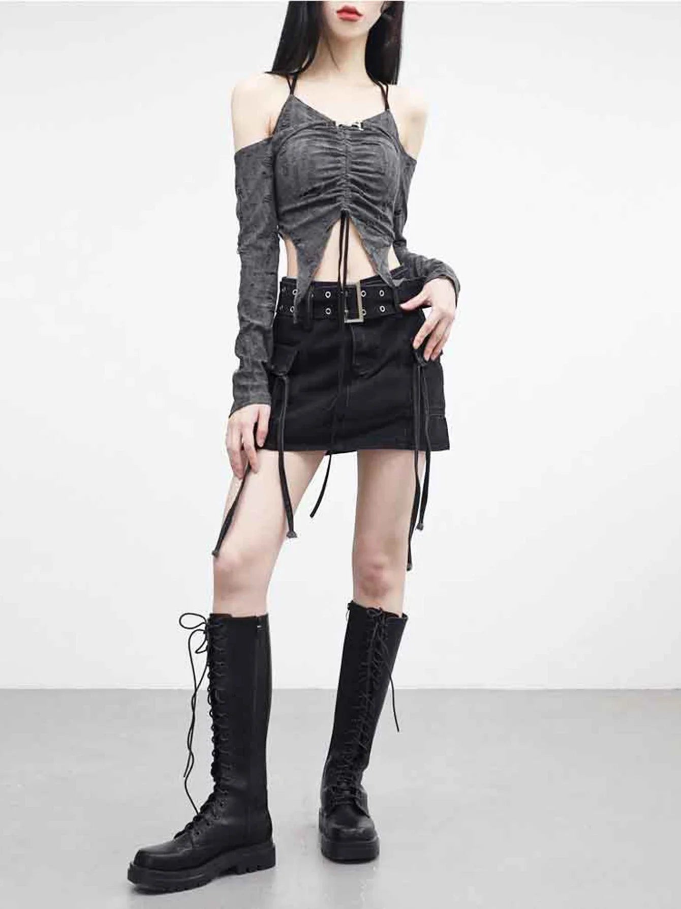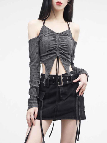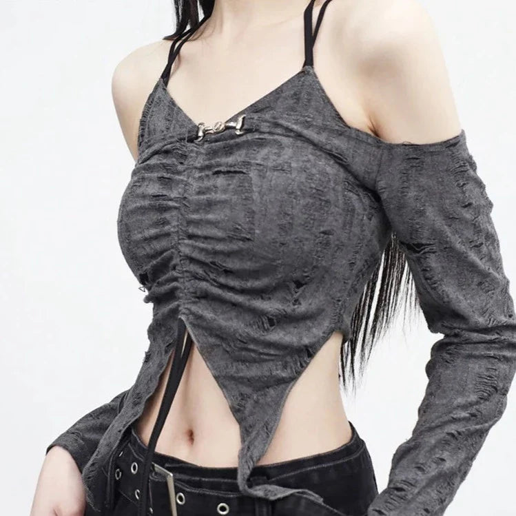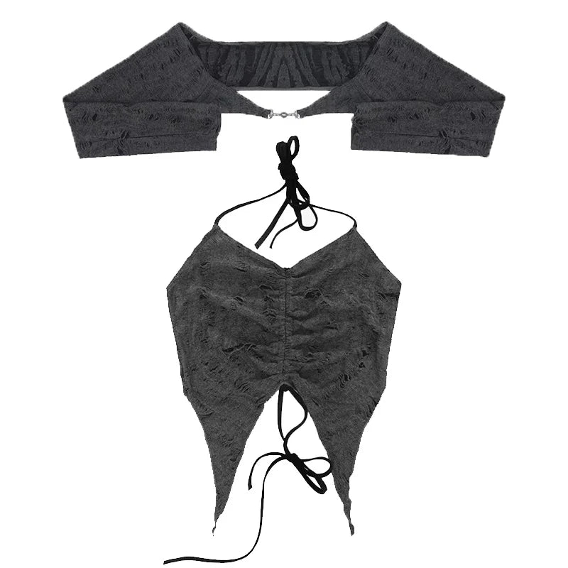 With this unique Gothic top, you showcase your rebellious spirit. This torn and elegant top is designed for women who dare to defy conventions and introduces you to the world of alternative fashion in a bold and elegant way. The oversized cut of this cardigan subtly reveals the shoulders, while the lacing creates an avant-garde gathering effect that accentuates your silhouette with mysterious charm. The structured material harmoniously blends with the dark, timeless hue, evoking the classic Gothic aesthetic in a modern language. The long sleeves end in frayed edges, giving the whole look a wild, untamed touch. The captivating detail lies in this corset-style finish, which can be adjusted with a drawstring, allowing you to play with the shape and fit at your whim. Paired effortlessly with black high-waisted jeans or vinyl skirts, this top allows you to embrace the darkness with flair. Ideal for rock concerts, evenings with friends, or to emphasize your individuality in everyday life. Let your alternative spirit run free and infuse your wardrobe with a touch of Gothic revolution.