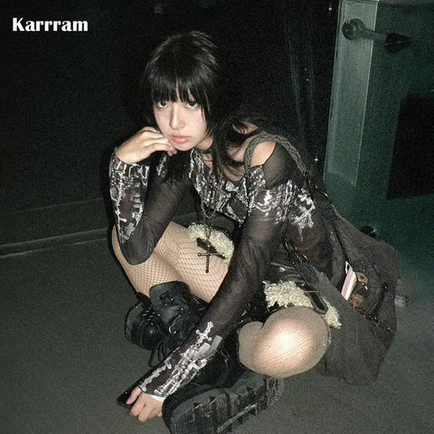 Aesthetic Grunge Mesh Tops with Tattoo Style Print