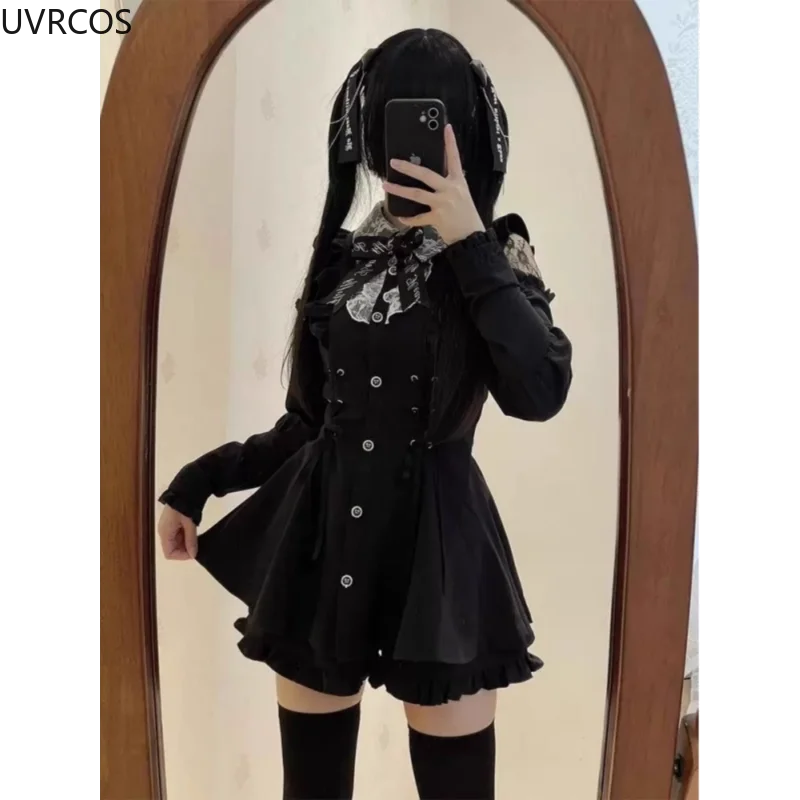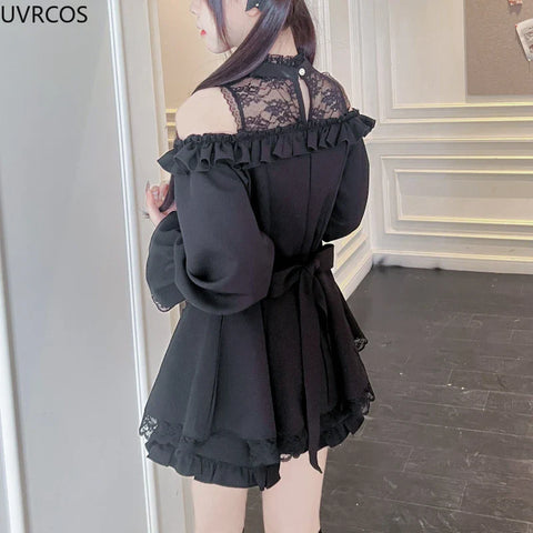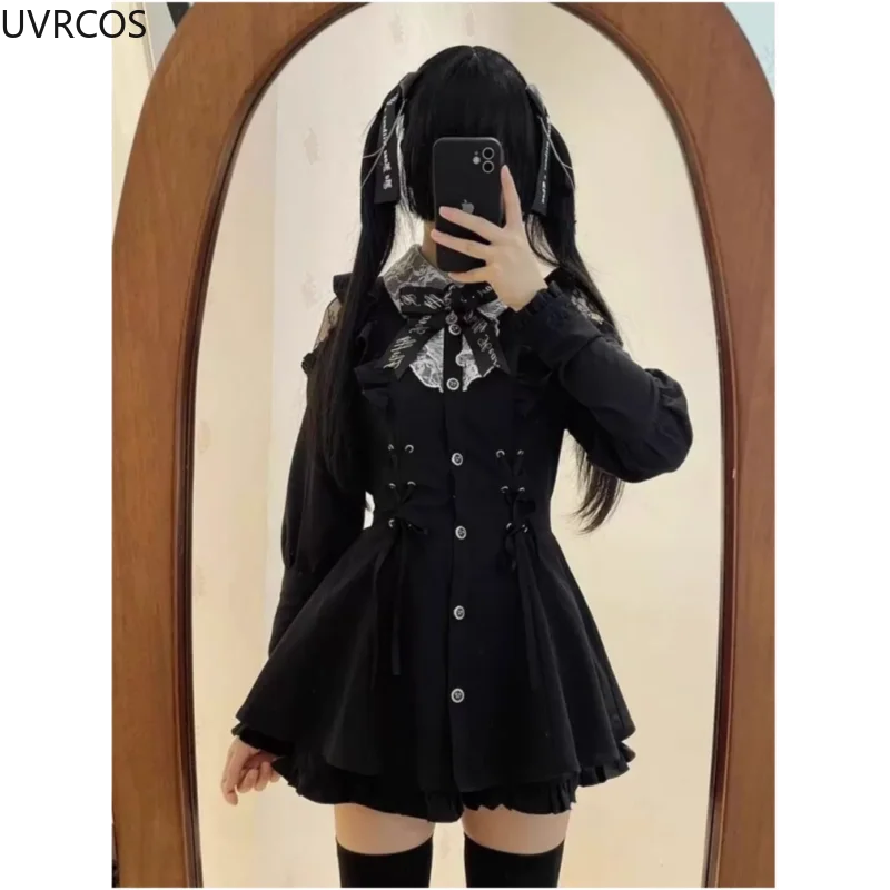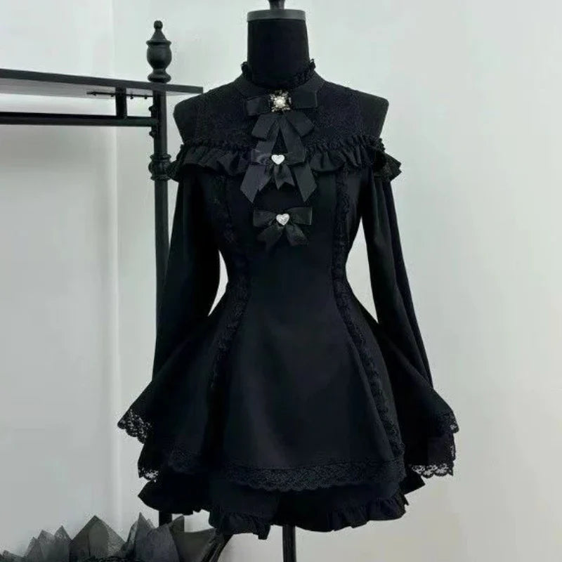Discover our exceptional outfit that combines mythical elegance with modern playfulness: the Gothic Japanese Style Short Dress with Bows. It was designed for women who want to express their unique personality. This versatile model in deep black features airy puff sleeves that exude a touch of charm while looking chic. Allow yourself to be seduced by the girlish details with satin bows and delicate lace trims that reveal just the right amount of skin. The slightly scooped neckline subtly allows the shoulders to peek through, a nod to the romantic world of Gothic.