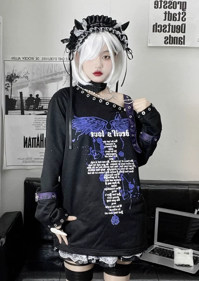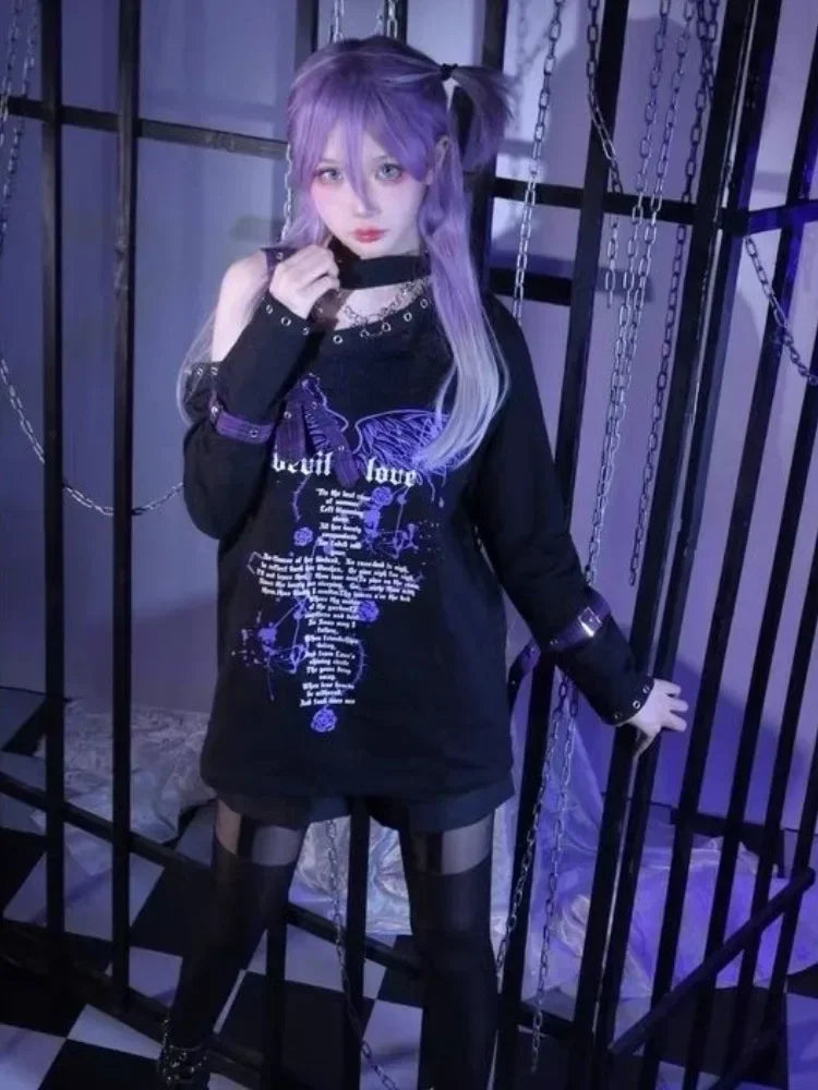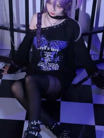 Dive into the bold world of alternative fashion with this Harajuku-inspired T-shirt. The deep black, loose-fitting top features a captivating asymmetrical Gothic design that catches the eye with a delicate violet print.
