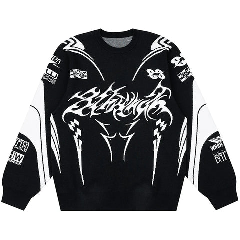 Immerse yourself in the bold world of this oversized knitted sweater, which showcases an uncompromising Gothic style. Made from soft cotton, it envelops you in pleasant warmth, perfect for cool days. With its loose fit, this garment is ideally suited to create a seductive casual look, providing you with plenty of freedom of movement. The dynamic graphic pattern blends deep black with radiant white and highlights a large stylized lettering reminiscent of a modern alternative culture.