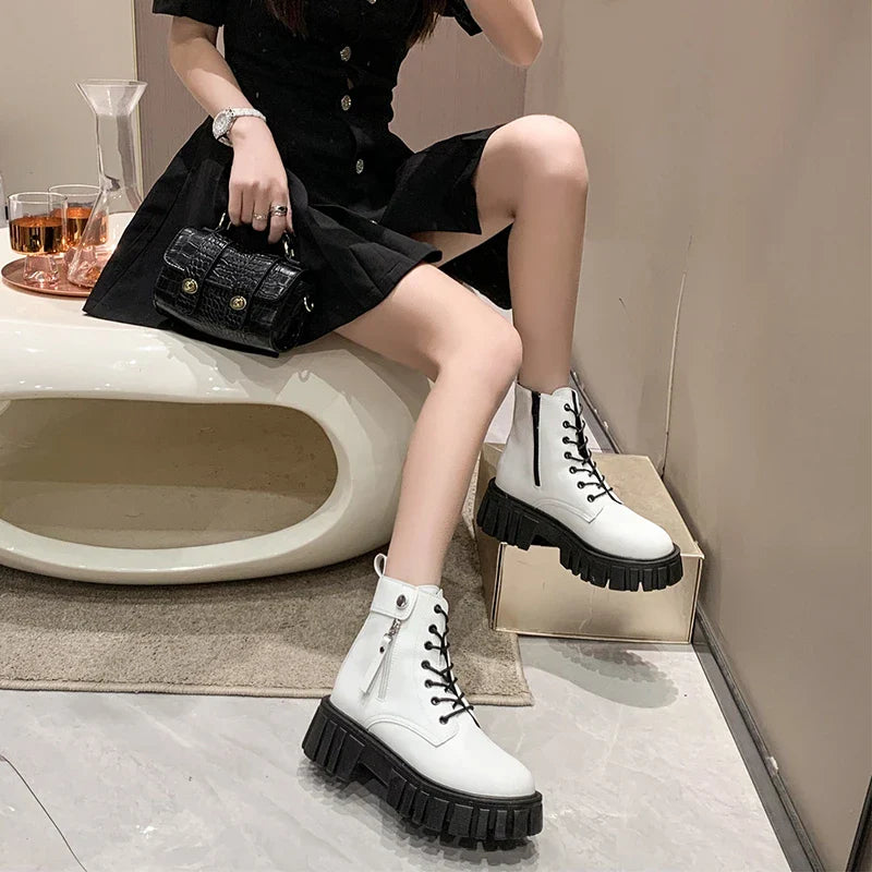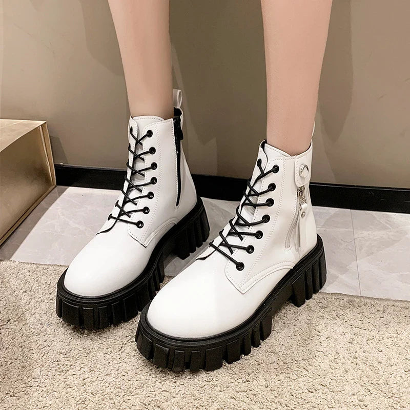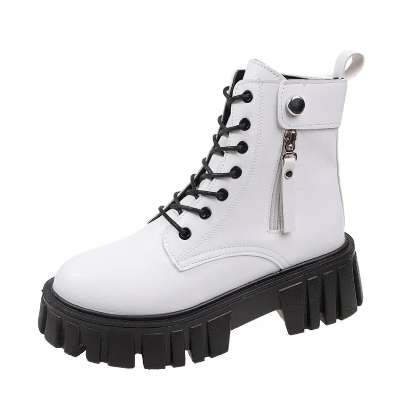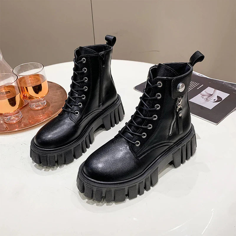 Show your style with these Gothic boots for women, inspired by the legendary Doc Martens. With their bold design and modern touch, these round-toe boots are the perfect choice for anyone looking to stand out from the crowd. They are made from high-quality synthetic leather, providing comfort and durability. The traditional lace-up closure is complemented by a practical side zipper that makes putting on and taking off easier. The oversized, rugged, and slip-resistant soles offer excellent traction and give your silhouette a striking height. Whether paired with an elegant skirt or casual jeans, these boots fit any occasion, whether for a night out or everyday wear. Express your personality and showcase your style with these must-have boots this season!
