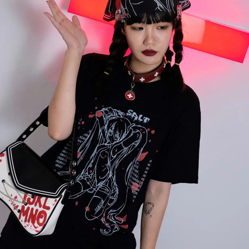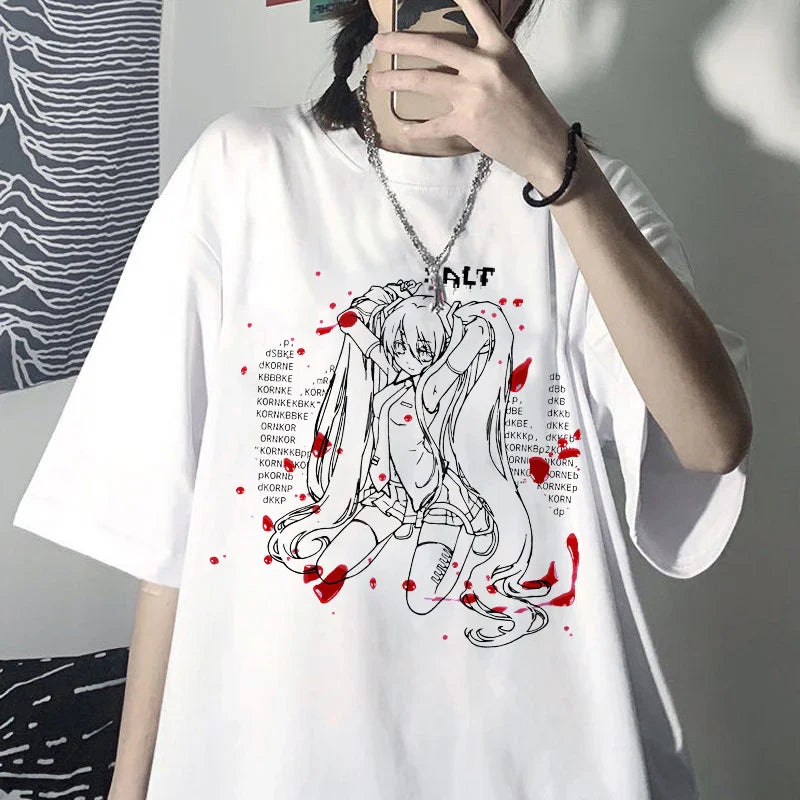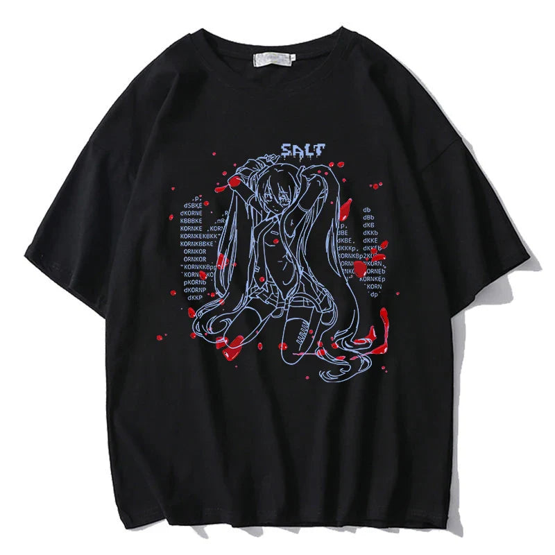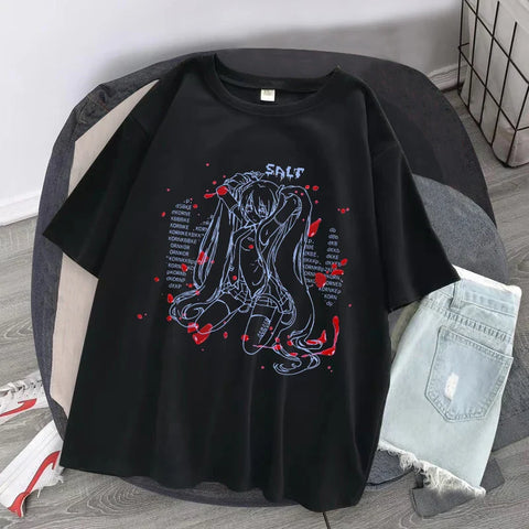 The classic round neck silhouette beautifully complements its monochrome print featuring an anime character with exquisite details, enhanced by splashes of bright red for undeniable visual impact. Mysterious words surround the figure, adding to the intrigue and originality of the design.