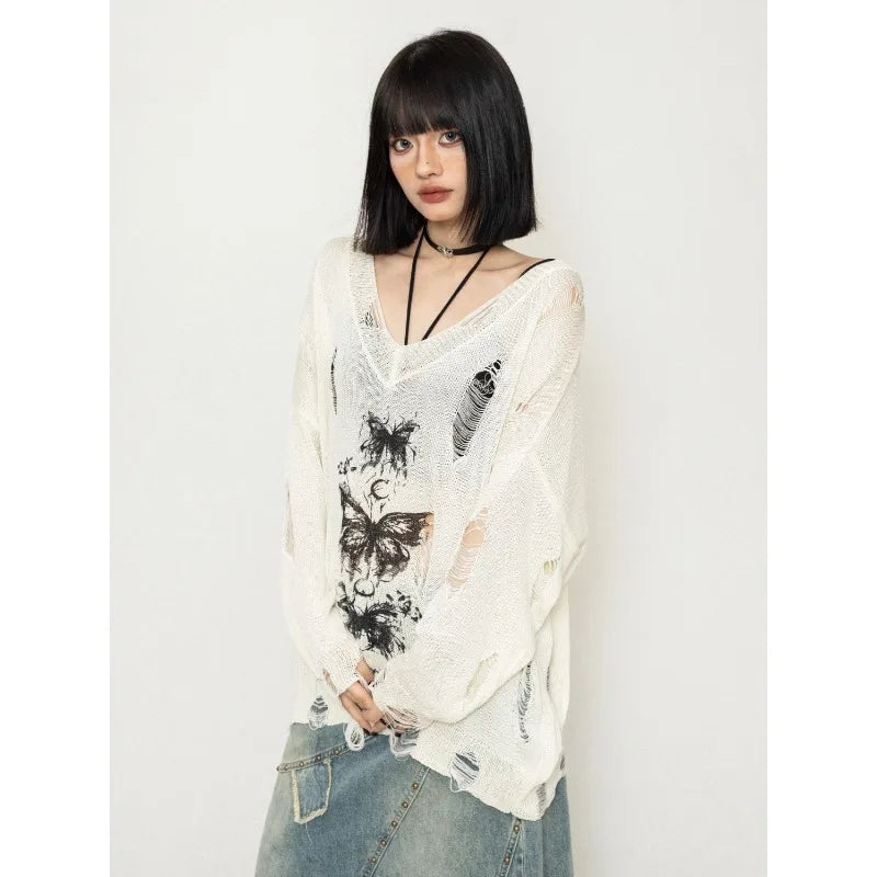 Discover this hollow knit sweater that combines Japanese style with a daring grunge touch. This long-sleeved model made of lightweight knit is perfect for free spirits who want to emphasize their unique style. The classic black is adorned with a delicate butterfly pattern that adds an artistic dimension to your outfit. With its loose fit and neckline details, this sweater offers comfort and a casual silhouette without compromising on elegance. Whether worn over a simple top or in a layered look with a flowing skirt, this sweater is ideal for stylish self-expression. Add a touch of mystery and creativity to your wardrobe.