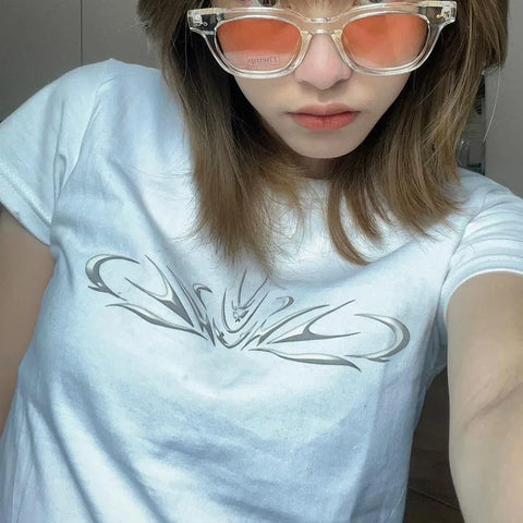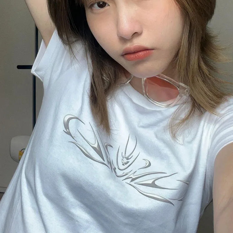 Stand out with this stylish white T-shirt that captures the essence of E-Girl style with a touch of 90s grunge. The black-and-white pattern evokes a rebellious spirit, yet it is versatile enough to be worn in everyday life. The mysterious, abstract print resembles a modern work of art and adds an avant-garde touch to your wardrobe. With short sleeves and a classic round neckline, this T-shirt is the perfect blend of comfort and fashion statement. The casual cut creates a laid-back look and pairs perfectly with frayed denim shorts or a snug black skirt to achieve a bold yet casual aesthetic. The soft, breathable material makes it an ideal choice for hot summer days, while the timeless design easily complements various accessories, from oversized sunglasses to chunky necklaces. Showcase your individuality and passion for alternative styles with this modern T-shirt that is hard to miss.