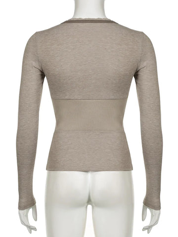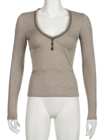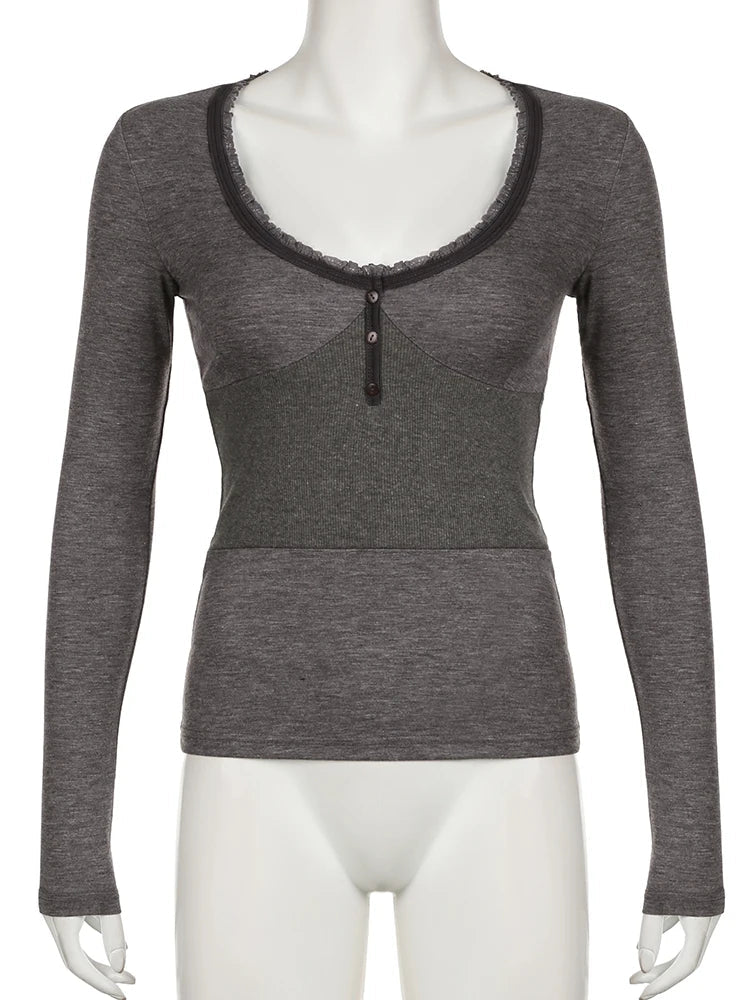 Discover the slim-fit T-shirt with a deep neckline in grunge patchwork, a must-have for all who love alternative fashion. This T-shirt is made from a soft, breathable fabric blend and accentuates your figure with its form-fitting design and daring neckline. The subtle buttons on the front give it a distinctive touch, while the long sleeves provide a casual yet chic style. The neutral color and unique texture make this top the perfect choice when paired with ripped jeans or a leather skirt. Whether you're heading to a concert or strolling through the city, this T-shirt is designed to make you shine while keeping you comfortable. Add a touch of grunge to your wardrobe and express your individuality with this timeless basic!