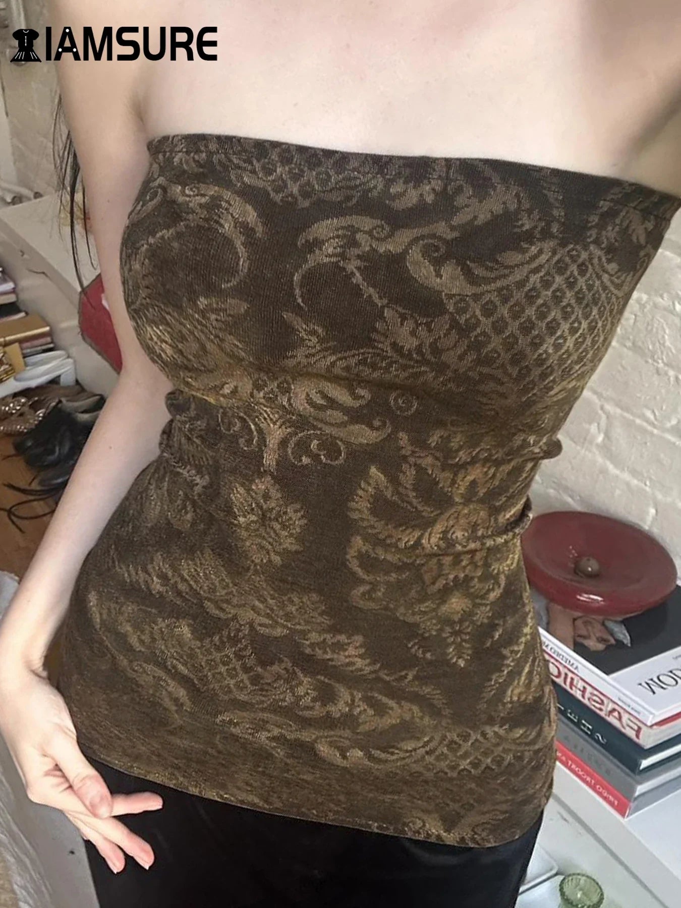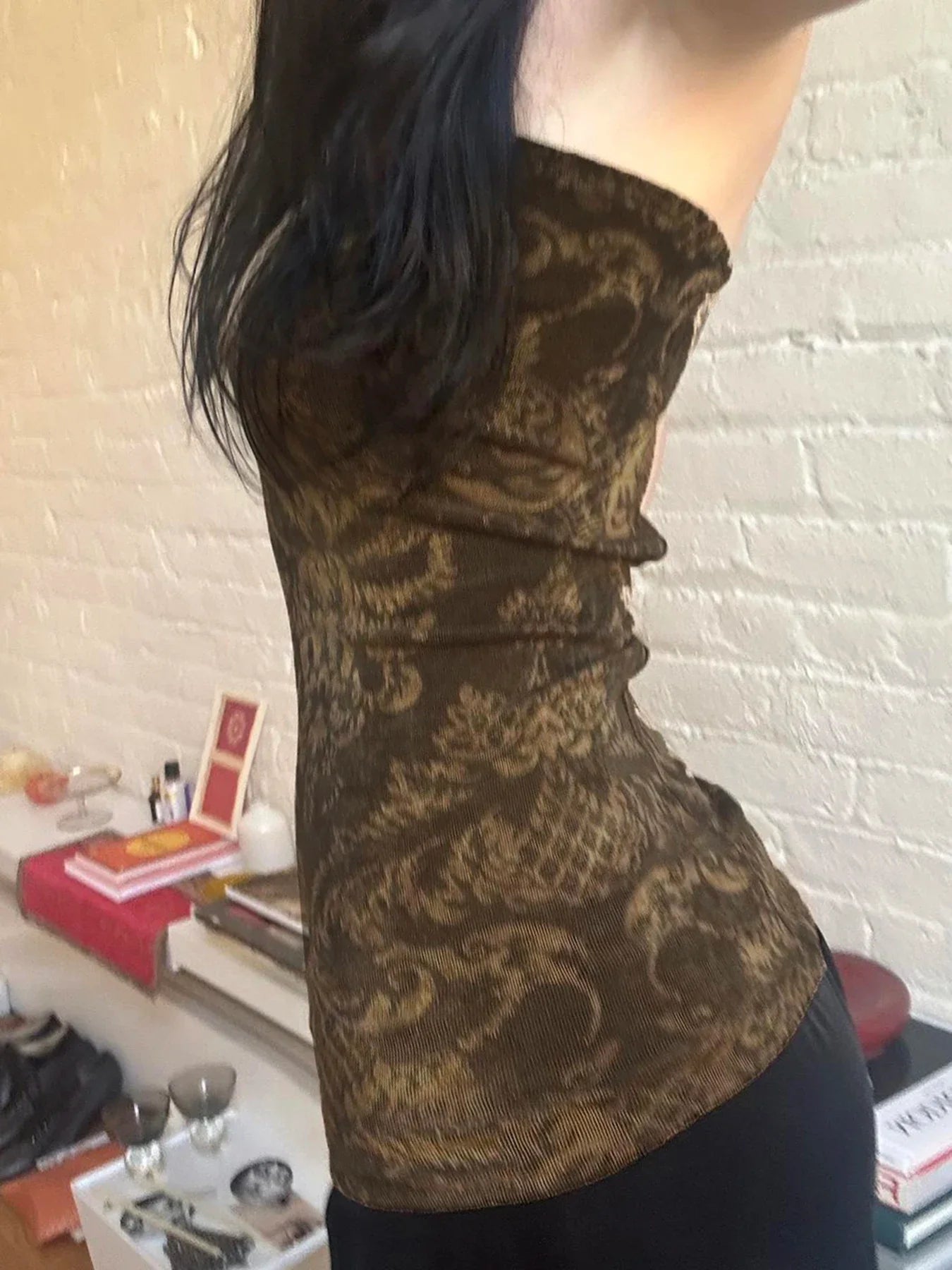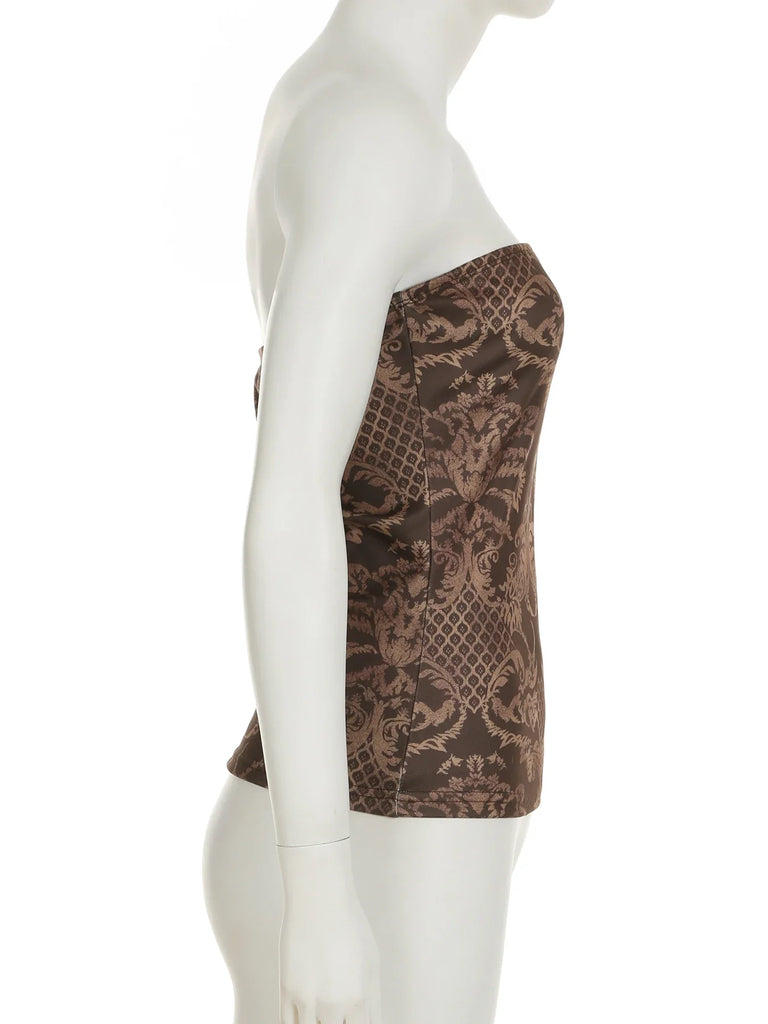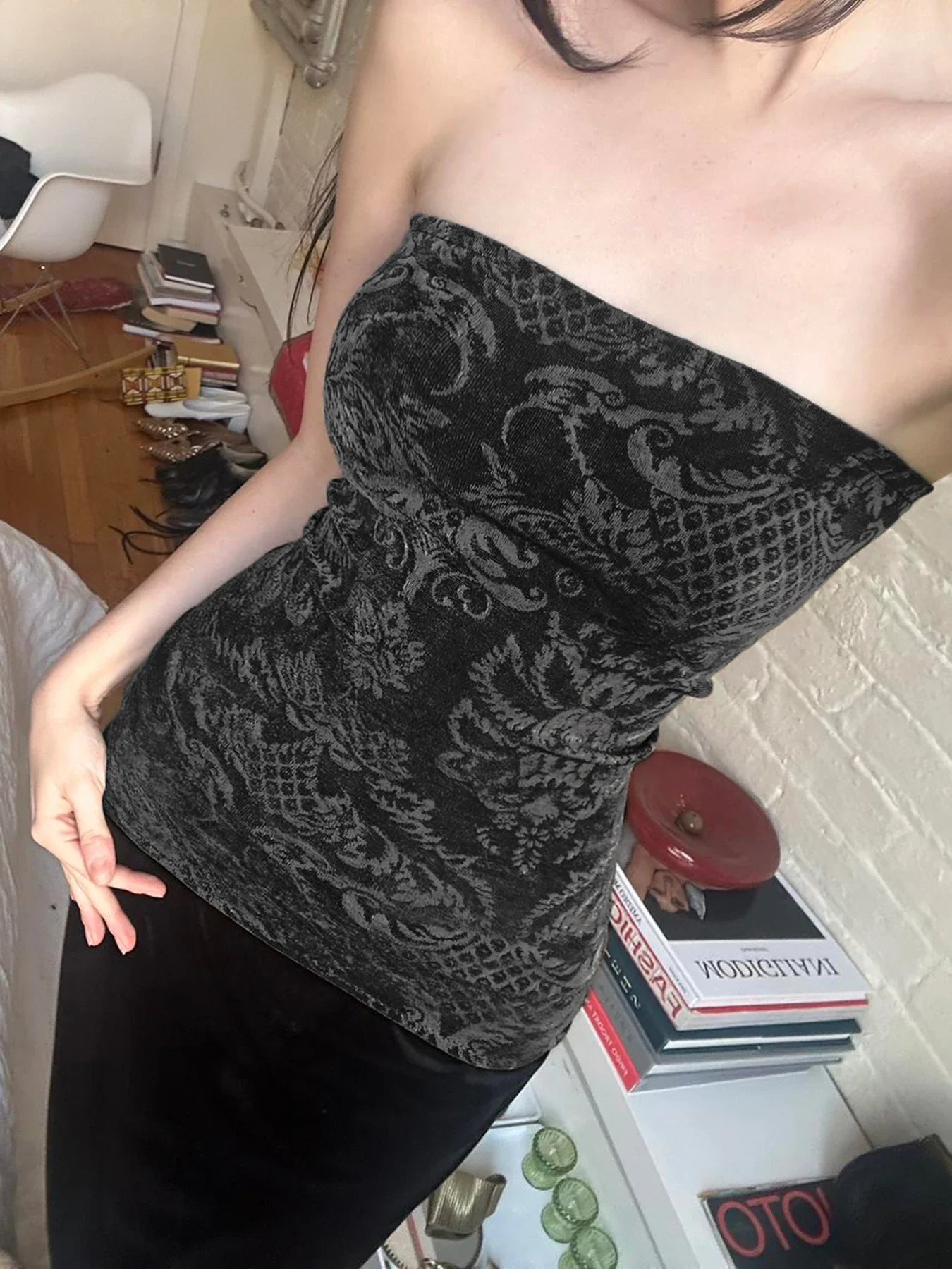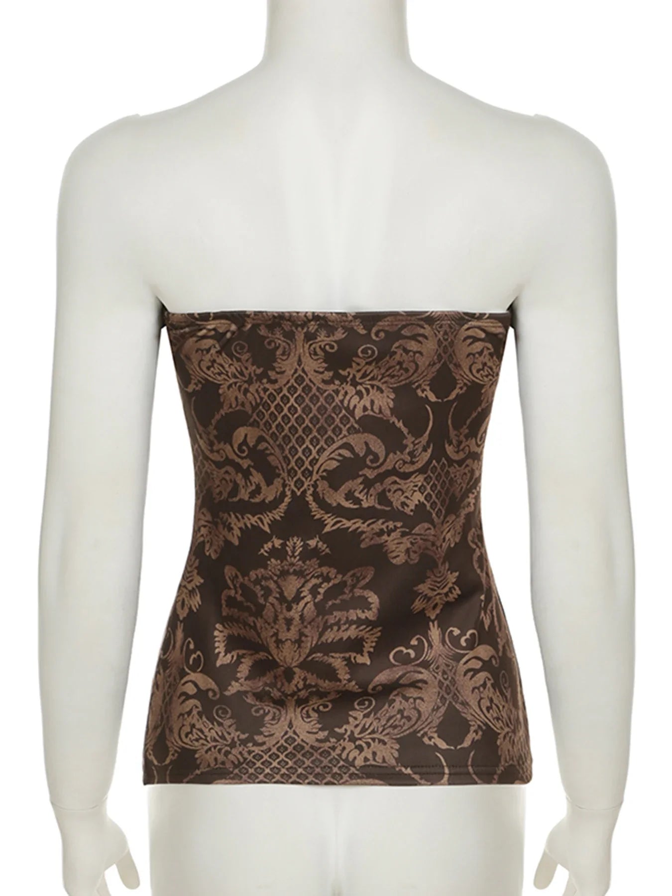 Dive into the grunge vibe with our vintage tube top in ecru, which represents a perfect combination of delicate charm and bold daring. The top, made from breathable, stretchy fabric, features a sleeveless cut that flatters your silhouette. The warm chocolate color with the subtle floral pattern conveys a melancholic and romantic atmosphere that speaks to the soul of every bohemian.