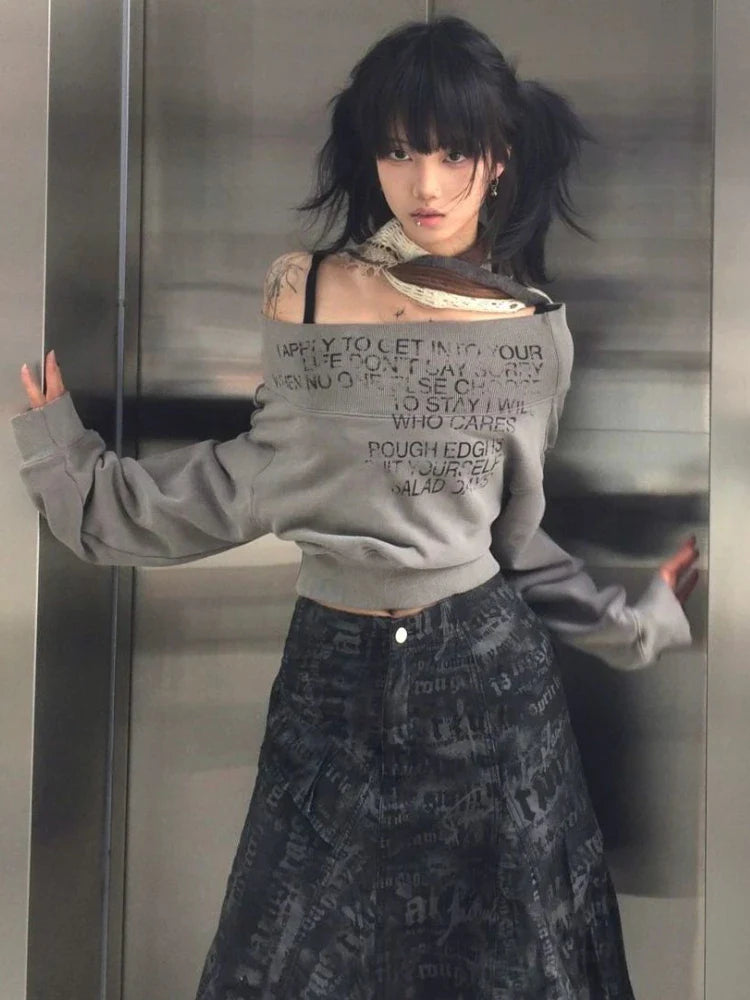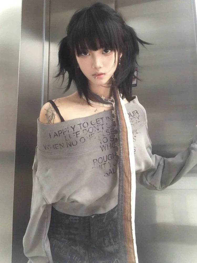 Gray Off-Shoulder Sweater for Women in Grunge Kpop Style