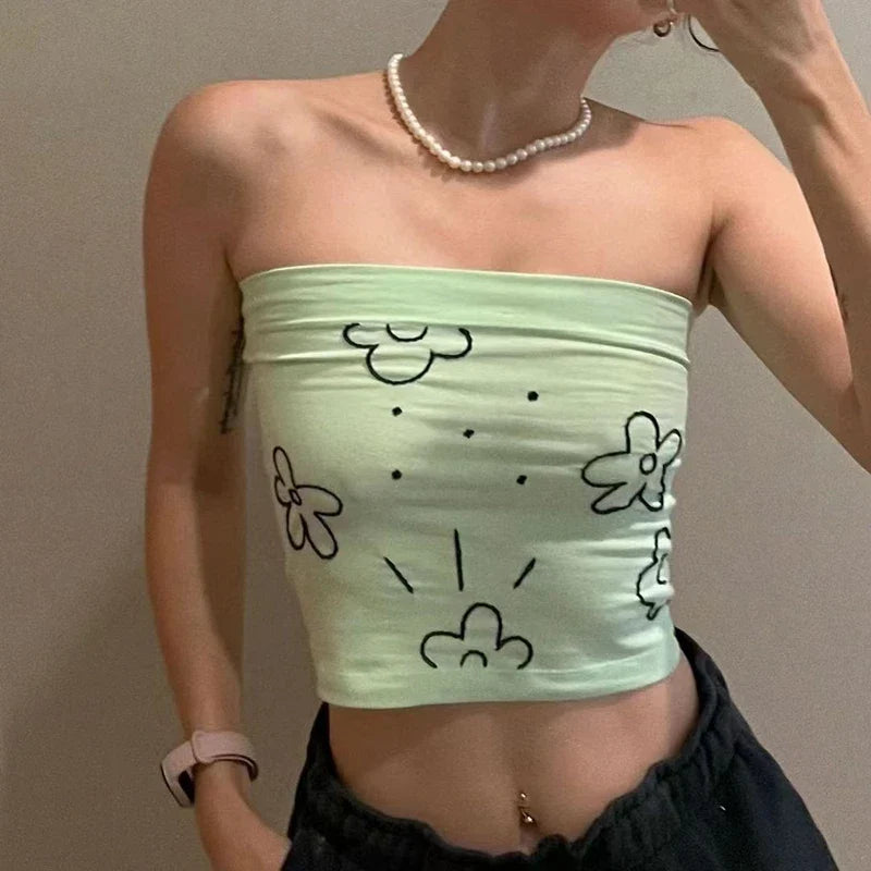 Dive into the enchanting world of Fairy Grunge with our light green tank top. It is a must-have for anyone looking to refresh their alternative wardrobe. This piece is sufficient to capture the charm and fairy-tale qualities of Fairy Grunge fashion while providing a fresh touch with its delicate green color. This strapless tank top, made from a soft fabric that conforms to your shapes, leaves the shoulders exposed and offers a bold, summery look. Adorned with naive patterns that exude a fantastic serenity, such as smiling clouds and delicate flowers, it is the perfect embodiment of the rebellious softness and nostalgia of the 90s. This top pairs easily with high-waisted jeans or a flared skirt and is a reliable companion for both your daily adventures and your nighttime outings. Just add a pearl necklace for a touch of elegance or layer it over a long-sleeved shirt to achieve a more complex style effect.
