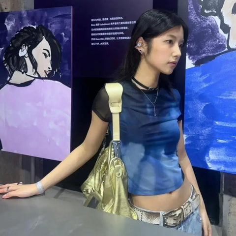 Dive into the bold world of grunge with this T-shirt featuring alternative accents. Designed for those who dare to assert their style, this top is the essence of streetwear fashion. It boasts short transparent mesh sleeves, an essential for a touch of mystery and sensuality. The dark blue color and subtle gradient add a rebellious and artistic dimension, perfect for wandering through urban alleys or for an electrifying concert.