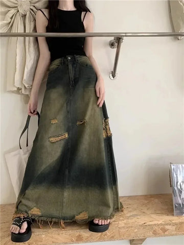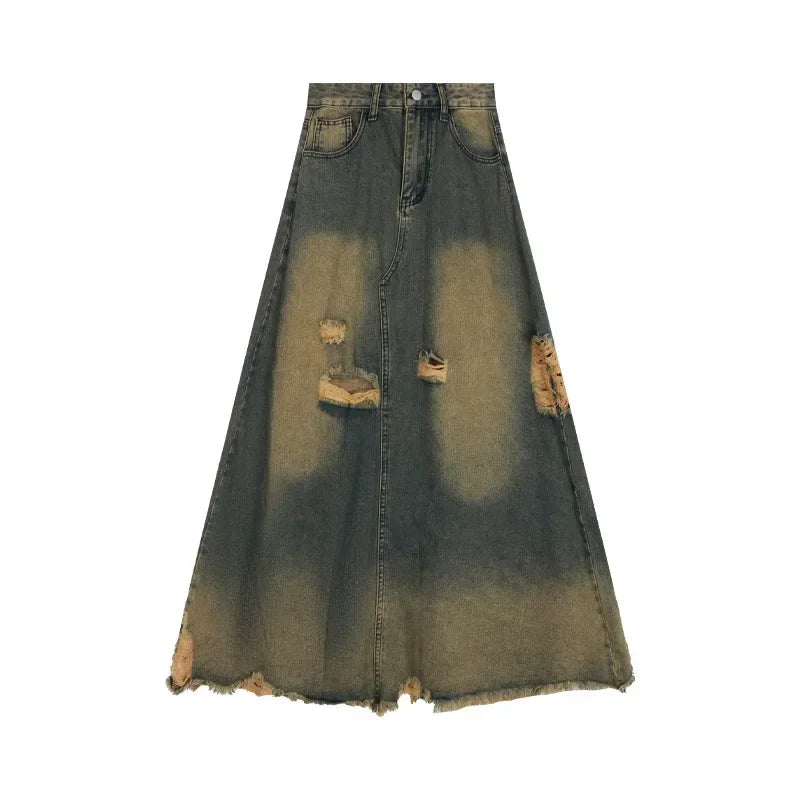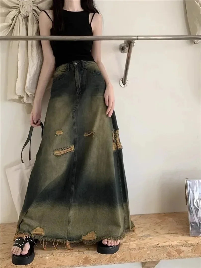Dive boldly and stylishly into the Y2K era with our frayed high-waisted denim skirt that screams character and individuality. This piece is an ode to vintage trends with a modern twist and is ideal for anyone unafraid to showcase a unique look. The high-waisted structure of this skirt gracefully traces the silhouette, while the frayed details and strategically placed holes add a rebellious and casual spirit. Each tear tells a story, a refusal to conform, and a determination to stay true to oneself. The floor-length design lends a mysterious, bohemian vibe, perfect for strolling along cobbled streets or playing under the starry sky at a music festival. The rough hem adds a raw, unfinished design element that reflects the gritty nature of alternative fashion. Made from high-quality denim, this skirt promises to withstand fleeting trends and become a lasting classic in your wardrobe.