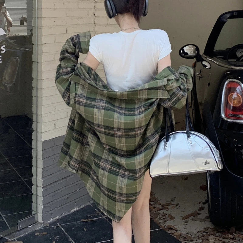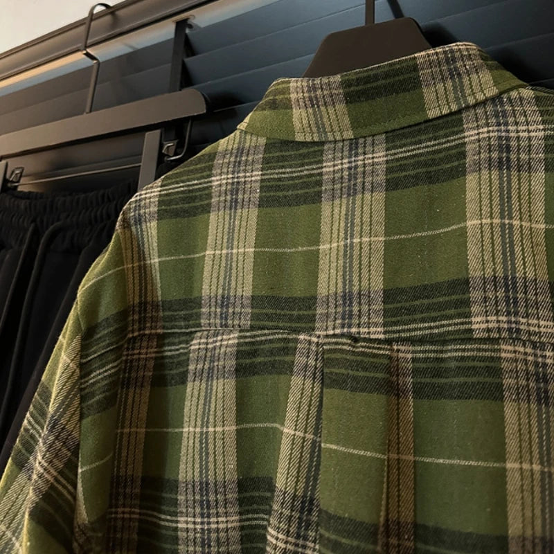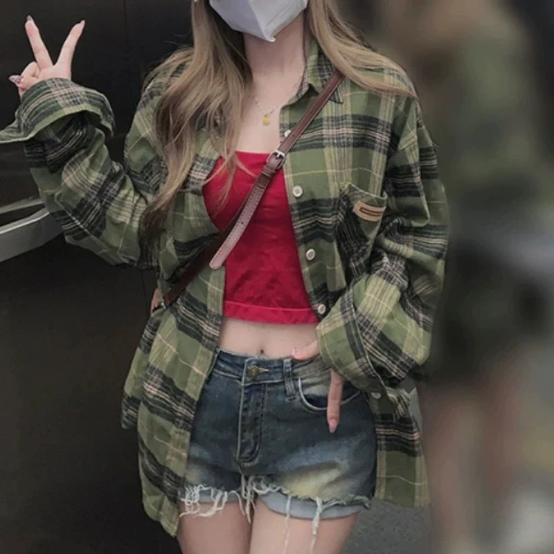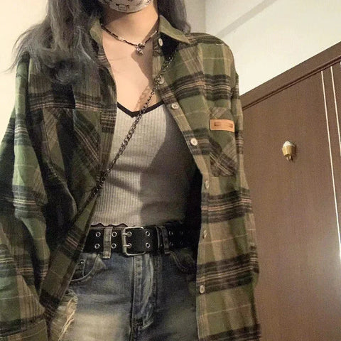 Discover the grunge shirt with a turn-down collar that adds a bold accent to your wardrobe. With its iconic check pattern, it is a must-have for fashion-conscious individuals seeking a casual yet chic look. The shirt, made from lightweight, breathable material, has a relaxed fit and is perfect for layering. Pair it with a tank top and ripped jeans for an irresistible Korean student look, or wear it over a dress for a soft, romantic look. The pocket detail adds a practical touch, while the green and black tones create a multi-faceted appearance that harmonizes with all your favorite pieces. Express your individuality and showcase an alternative style with this must-have item that stands out from the crowd!