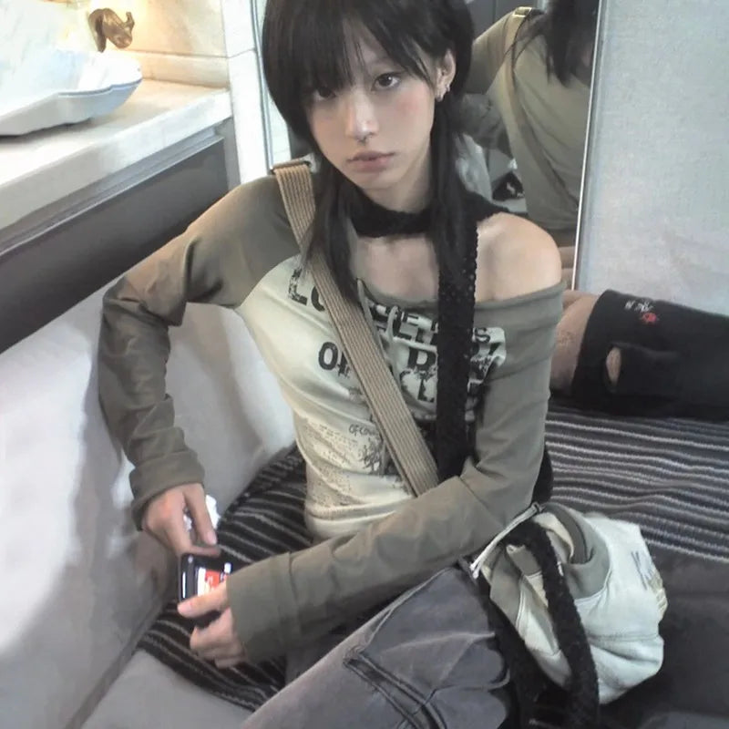 Dive into the alternative world with our Japanese off-shoulder t-shirt, the epitome of 90s grunge fashion. With its bold look and striking graffiti print, this casual top is perfect for anyone wanting to express their unique style. Made from high-quality materials, it flatters the body and offers optimal comfort. The long sleeves give it a mysterious touch, while the revealing shoulder design emphasizes a sexy and laid-back look. Whether in the city or at night, this t-shirt can easily be paired with your favorite jeans or skirts to create a trendy and timeless look. Get this must-have into your wardrobe and showcase your personality with alternative fashion.