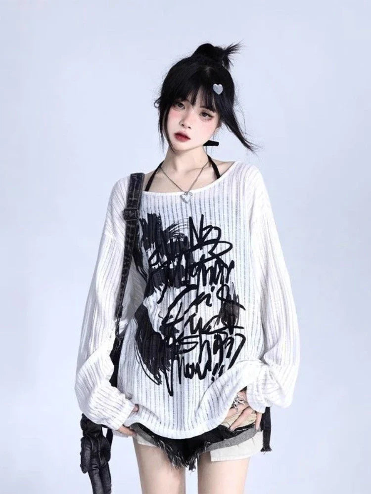 Dive into the unique world of grunge style with our Women's T-Shirt Autumn Fashion Grunge Long Sleeves. The t-shirt, made from soft, lightweight material, offers unparalleled comfort throughout the day and is perfect for cool days and casual evenings. The cheeky design features a black graphic pattern on a white striped background, combining originality with a rebellious attitude. The long sleeves add a casual elegance to the shirt, while the loose fit ensures a modern and trendy look. Pair it with denim shorts or leather pants for a striking outfit. Express your individuality and make a fashion statement with this t-shirt - ideal for anyone looking to embrace their alternative side!