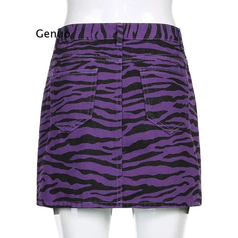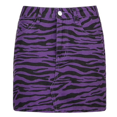 Claim your originality with this high-waisted mini skirt that perfectly hugs your curves while adding a rebellious touch to your look. The bold zebra pattern in vibrant shades of purple against a black background aligns with the animal print trend while adding a unique pastel softness.