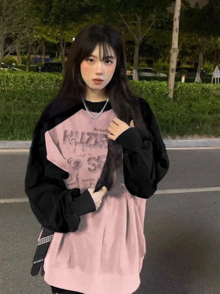 Entdecken Sie mit unserem Patchwork Contrast Color Letter Print O Neck Hoodie die perfekte Kombination aus Stil und Komfort. Dieses grunge-inspirierte Sweatshirt ist nicht nur ein Augenmerk, sondern auch eine Hommage an den individuellen Ausdruck. Mit seinem einzigartigen Farbmix aus zartem Rosa und tiefem Schwarz bringt dieser Hoodie einen frischen, urbanen Look in jede Garderobe. Der expressive Schriftzug verleiht dem Outfit eine rebellische Note und sorgt dafür, dass Sie garantiert im Mittelpunkt stehen. Die lockere Passform und die weiche Baumwollmischung garantieren ultimativen Tragekomfort – ideal für einen lässigen Tag in der Stadt oder eine gemütliche Nacht mit Freunden. Vervollständigen Sie Ihren alternativen Look mit diesem vielseitigen Hoodie, der sich perfekt mit Jeans, Leggings oder einem stylischen Rock kombinieren lässt. Zeigen Sie Ihre Persönlichkeit und heben Sie sich von der Masse ab – mit diesem einzigartigen Stück wird Mode zur Kunst!