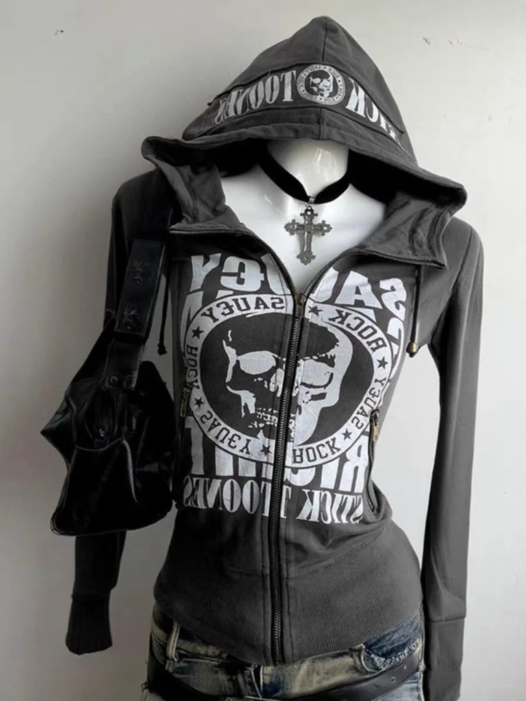 Umarmen Sie Ihre rebellische Seite mit unserem Sweatshirt mit Reißverschlusskapuze! Das Modell ist aus weicher, bequemer Baumwolle gefertigt und verfügt über ein gewagtes Design mit einem beeindruckenden Totenkopfmotiv und Schriftzügen, die keine Wünsche offen lassen. Die eng anliegende Passform betont Ihre Figur und sorgt gleichzeitig für einen lässigen, modernen Stil. Dieses Sweatshirt ist ideal für Ausflüge mit Freunden und darf in der Garderobe von Liebhabern alternativer Mode nicht fehlen. Die praktische Kapuze und die Reißverschlusstaschen verleihen dem Look einen funktionalen Touch und sind perfekt, um den Alltag mit Attitüde zu meistern. Kombinieren Sie es mit einer zerrissenen Jeans oder einer Lederhose für einen absolut unvergesslichen Look! Zeigen Sie Ihre Individualität und bleiben Sie mit diesem Sweatshirt, das Komfort mit einem gewagten Stil verbindet, immer auf der Höhe der Zeit. Lassen Sie sich die Gelegenheit nicht entgehen, in der Menge zu glänzen!
