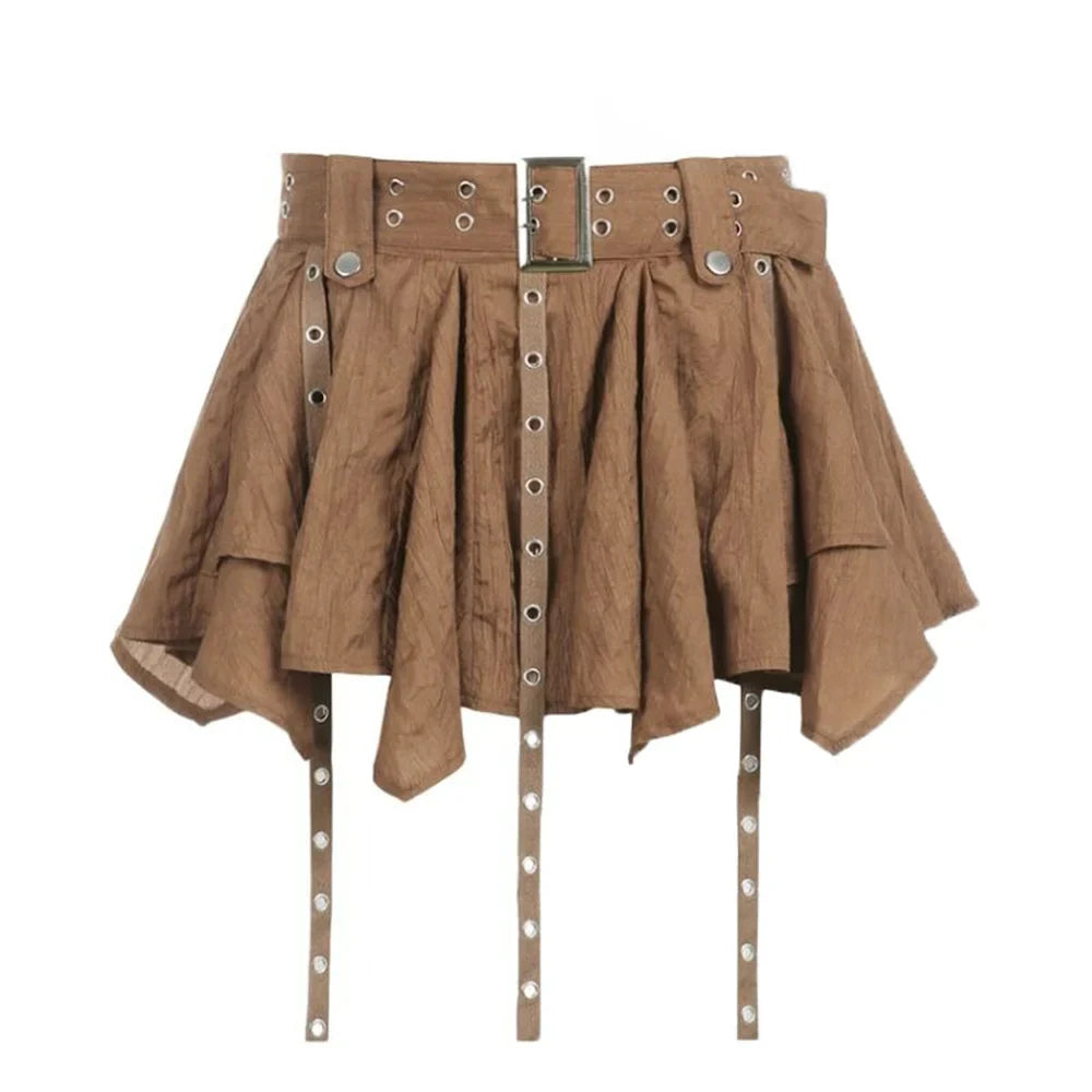 With this brown punk mini skirt in a vintage look, you can express your rebellious spirit while adding a touch of originality to your alternative wardrobe. This skirt impresses not only with its unique asymmetrical design but also with its simple ruffles that give it a hint of femininity. With its metal details and adjustable straps, this piece fits perfectly into the indie trend while maintaining a deeply rebellious soul. The slightly crumpled fabric offers a rich texture and a casual look. Its warm earthy brown color evokes retro aesthetics and is easy to pair with a variety of tops and accessories. Whether heading to a concert or strolling through the city, this skirt is the star of your outfit, showcasing character and stylistic independence. The careful craftsmanship and functional comfort demonstrate that style does not come at the expense of comfort.