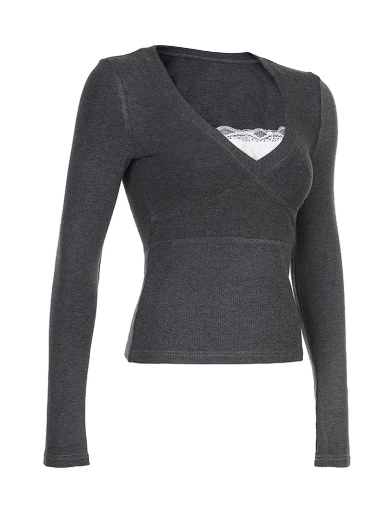 Long-Sleeved Lace Crop Top with V-Neck in Grunge Style