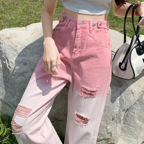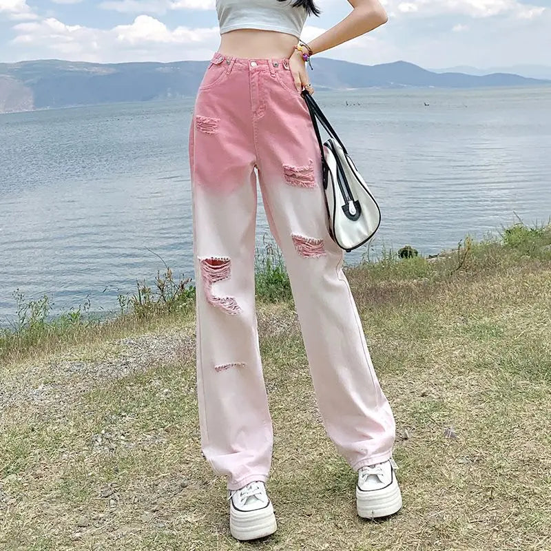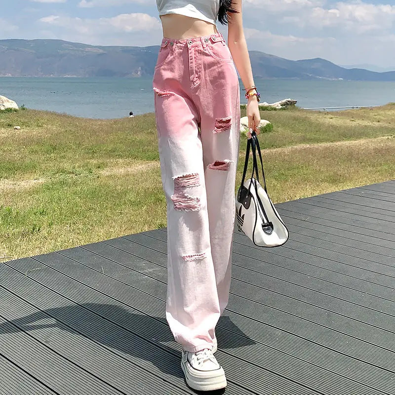 Make a bold statement with our latest creation - a pair of jeans that is both trendy and timeless, perfect for anyone looking to add a touch of originality to their wardrobe. These wide-leg jeans not only offer exceptional comfort with their high waist but also provide a striking look with their layered finish and trendy destroyed details. Delicate shades of pink harmoniously blend with simple white, creating a subtle yet captivating gradient effect. Furthermore, the strategically placed cutouts give these pants a rebellious dimension - perfect for turning heads during your city outings. Each tear reveals a hint of boldness and reflects a free and wild spirit. The design is complemented by a classic button and zipper closure, along with practical pockets to merge style and functionality.