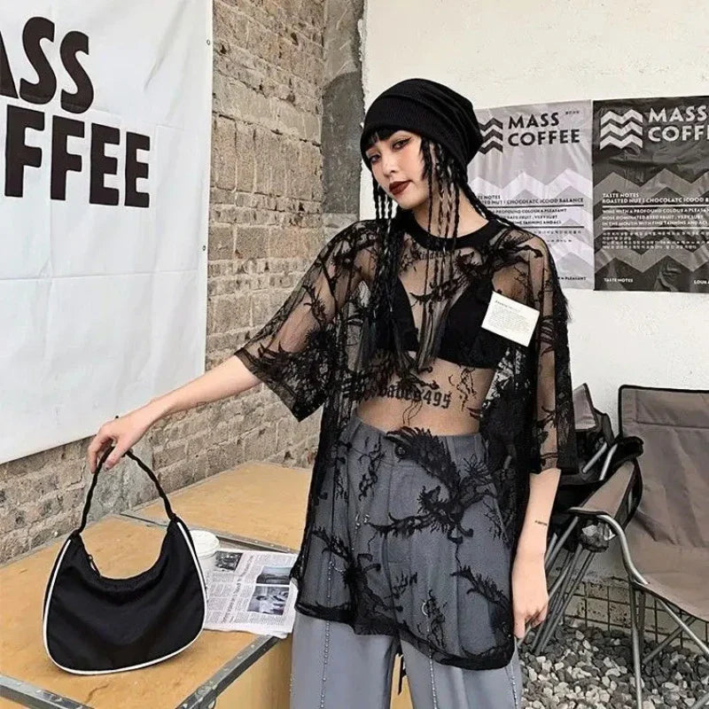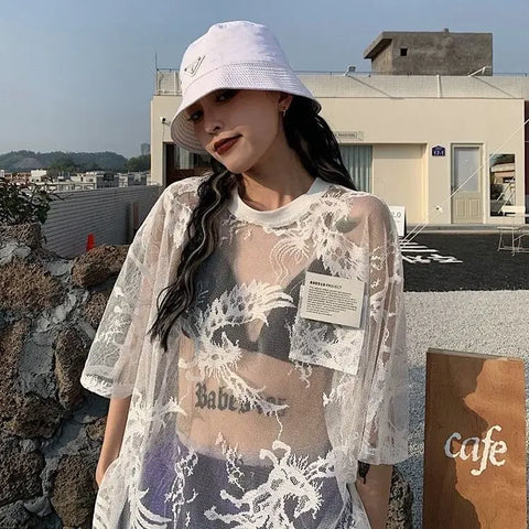 Discover our Y2K T-shirt for ladies, a unique piece that combines boldness and elegance. Made from delicate, transparent fabric, this top highlights your free spirit and alternative style. Let yourself be enchanted by its refined details, with subtle floral patterns dancing across the surface and adding a delicate touch to your look. This versatile creation can be worn for an evening with friends or for a casual look in the city. Pair it with a crop top or bralette for an even trendier effect. The lightweight design ensures optimal comfort all day long. Showcase your bold style and make waves with this essential piece of urban fashion. Rediscover the beauty of contrast between transparent and opulent and let your personality bloom through this captivating T-shirt.