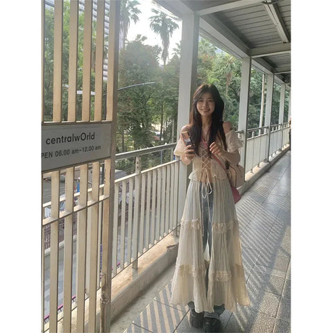 Discover the undeniable charm of our dress "Douceur Ébouriffée," the highlight for anyone looking for a romantic and original indie style. This cream-colored dress with its ruffled boat neck invites you to feel gentle and carefree on beautiful days. The silhouette is refined by a fitted bodice with ribbon details, gracefully hugging the figure and gently accentuating the waist before flowing into a light, swinging skirt. The short sleeves adorned with ruffles and lace add a touch of bohemian that harmonizes with every gentle breeze. The dress is made from a airy fabric and can be paired with flat sandals for a casual look or with high heels for an elegant summer outing. It showcases the wearers' passion for dresses that tell a story - the story of a free and dreamy femininity.