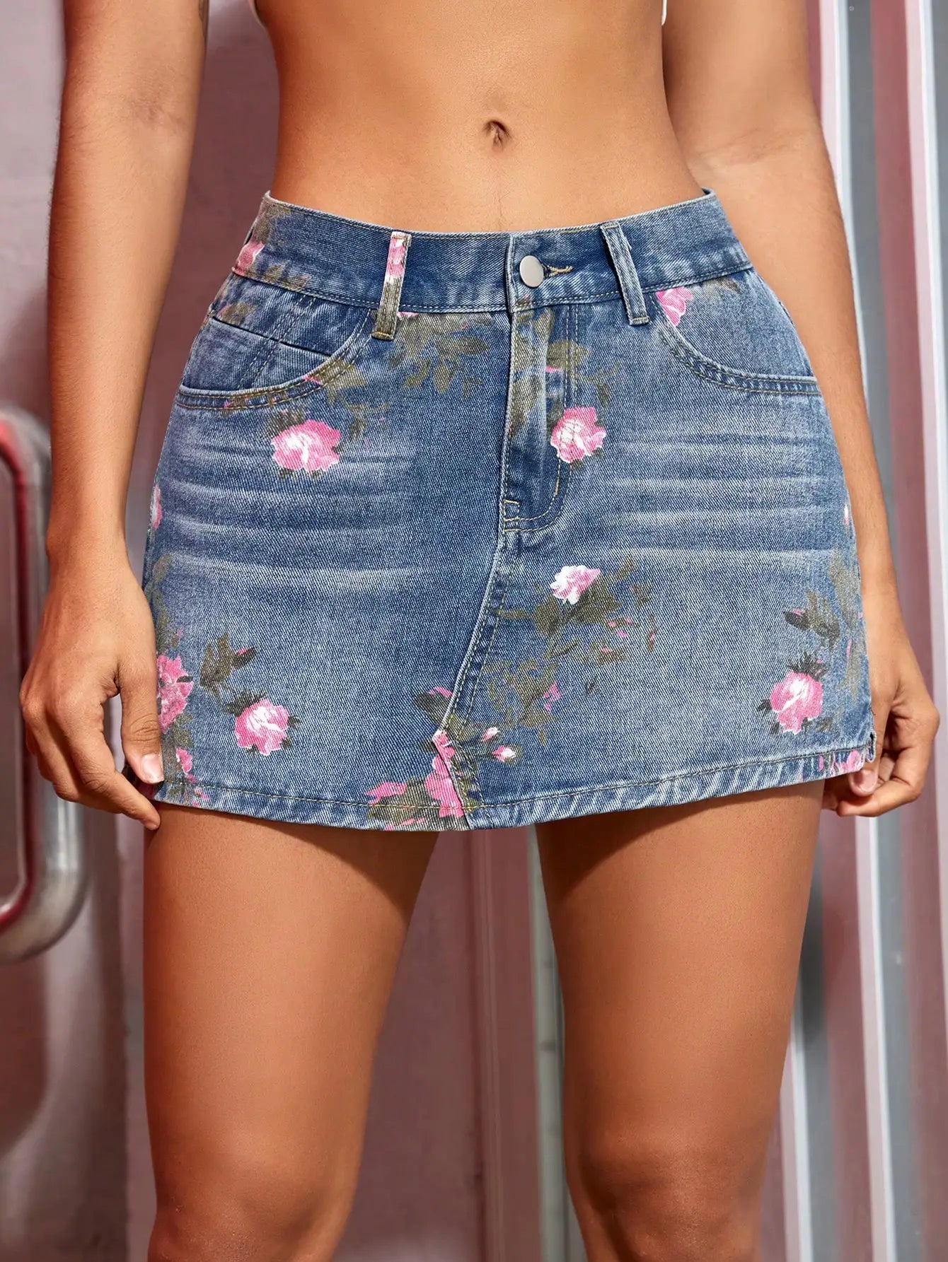 Floral Denim Mini Skirt with Slit Indie Alternative Look