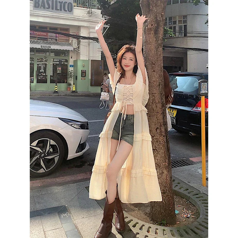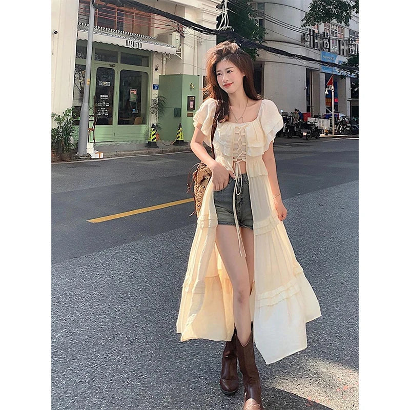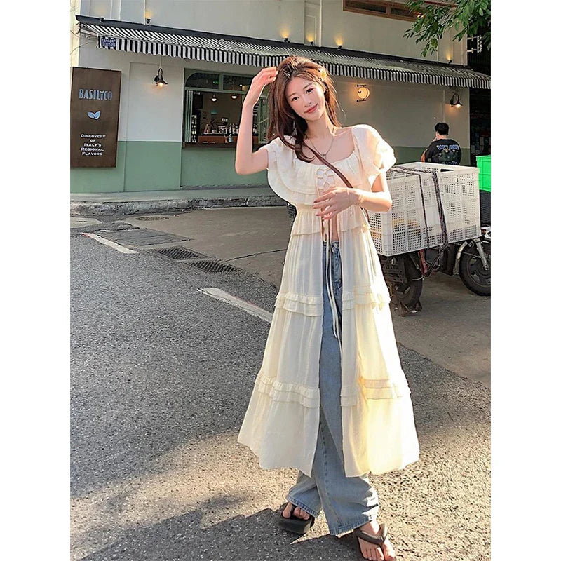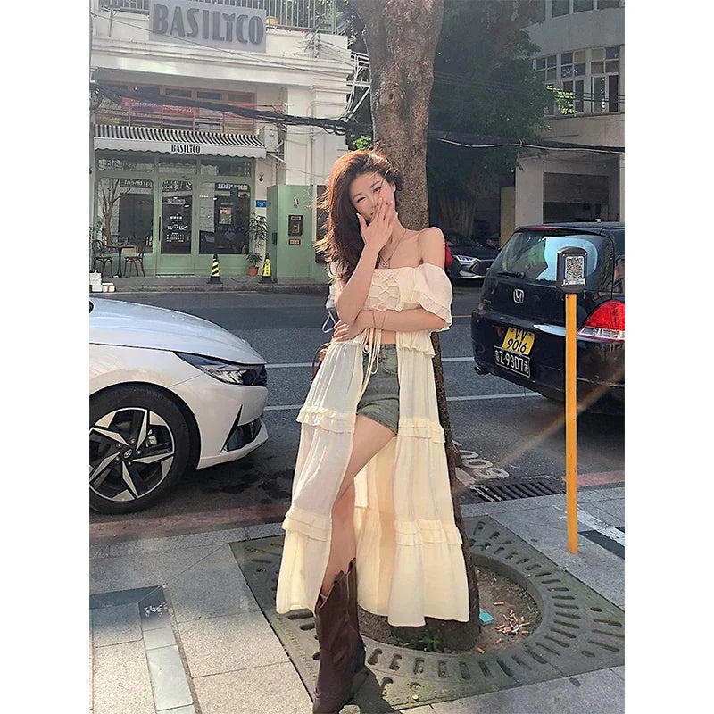 Let yourself be seduced by this midi dress with undeniable charm that reflects an indie spirit with a touch of streetwear. The flowing movements of this piece blend with a refined aesthetic that invites an urban outing straight from the streets of Korea. The loose cut features an open neckline that gently highlights the shoulders, while the ruffles add a touch of lightness and movement. The upper part of the garment showcases delicate bandage work, creating an attractive and modern play with transparency. The airy fabric, likely a cotton blend that impresses with its drape and softness, is adorned with subtle details that attract attention. This dress in pastel cream tones is an invitation to a fresh, airy style for warm days. Pair it with brown ankle boots for a strong contrast or with sandals for a casual, summery look.