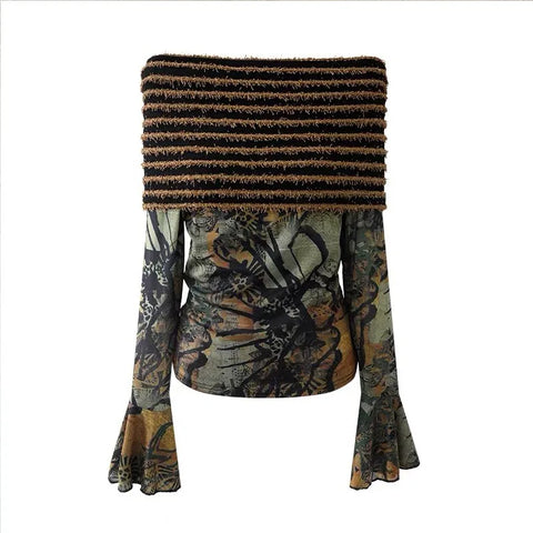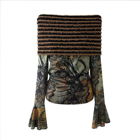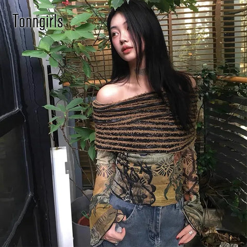 Discover our Women's Off Shoulder Patchwork Skinny T-Shirt, a bold piece that combines comfort and unique style. Inspired by indie aesthetics, this blouse features a daring neckline and a colorful patchwork design that attracts all eyes. Made from a soft, stretchy blend of materials, it perfectly conforms to your figure while offering freedom of movement. The flared sleeves add a touch of boho-chic and are ideal for anyone looking to stand out on any occasion. Wear it with high-waisted jeans for a casual look or pair it with a skirt for a more refined appearance. No matter how you choose to style it, this T-shirt guarantees you will be at the center of alternative trends!