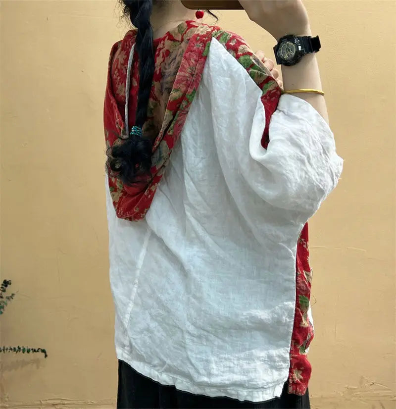 Discover a unique piece for women who dare to assert their style: our oversized shirt with Indie patchwork. Every detail of this shirt radiates originality and boldness. Made from lightweight, breathable summer materials, this shirt is ideal for hot days or cool evenings. The daring mix of fabrics with vibrant floral patterns on a gray denim background creates a strong contrast that draws attention. The large, practical pockets not only add a functional aspect but also enhance the relaxed boho aesthetic of the garment. Details like the pink cord at the neck and the texture effects give the shirt a handcrafted and individual character. Whether strolling through the city or having a picnic in the countryside, this shirt is the perfect choice for anyone looking to add a touch of eccentricity to their wardrobe.