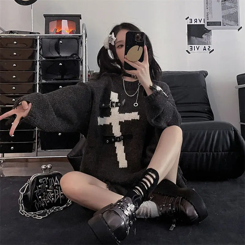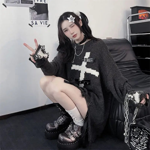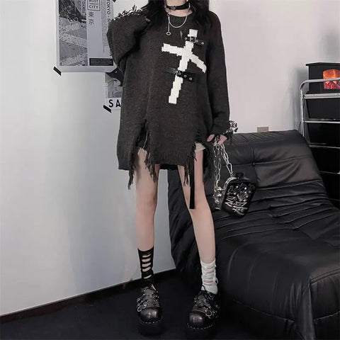 Looking for a unique and daring look? This black gothic sweater is the perfect accessory to give your wardrobe a mysterious touch. It is made from soft and comfortable knit and elegantly hugs your silhouette thanks to its oversized fit. What's the highlight? A bold cross pattern that contrasts with the deep black of the sweater and gets a rebellious touch through faux leather details. The frayed edges and distinctive seams on the sleeves, emphasized by creative openings, give the sweater a casual yet stylish look. The sweater is versatile and can be easily paired with ripped jeans for a day out in the city or with a black skirt for a more elegant evening. Wear it with leather accessories to complete your alternative look and make a statement everywhere you go!